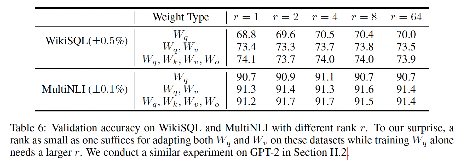 Table 6 显示,令人惊讶的是,即使 LORA 的表现也具有竞争力(相对于仅仅适配 update matrix "intrinsic rank"。为进一步支持这一发现,我们检查了不同 low-rank adaptation matrix 就足够了。