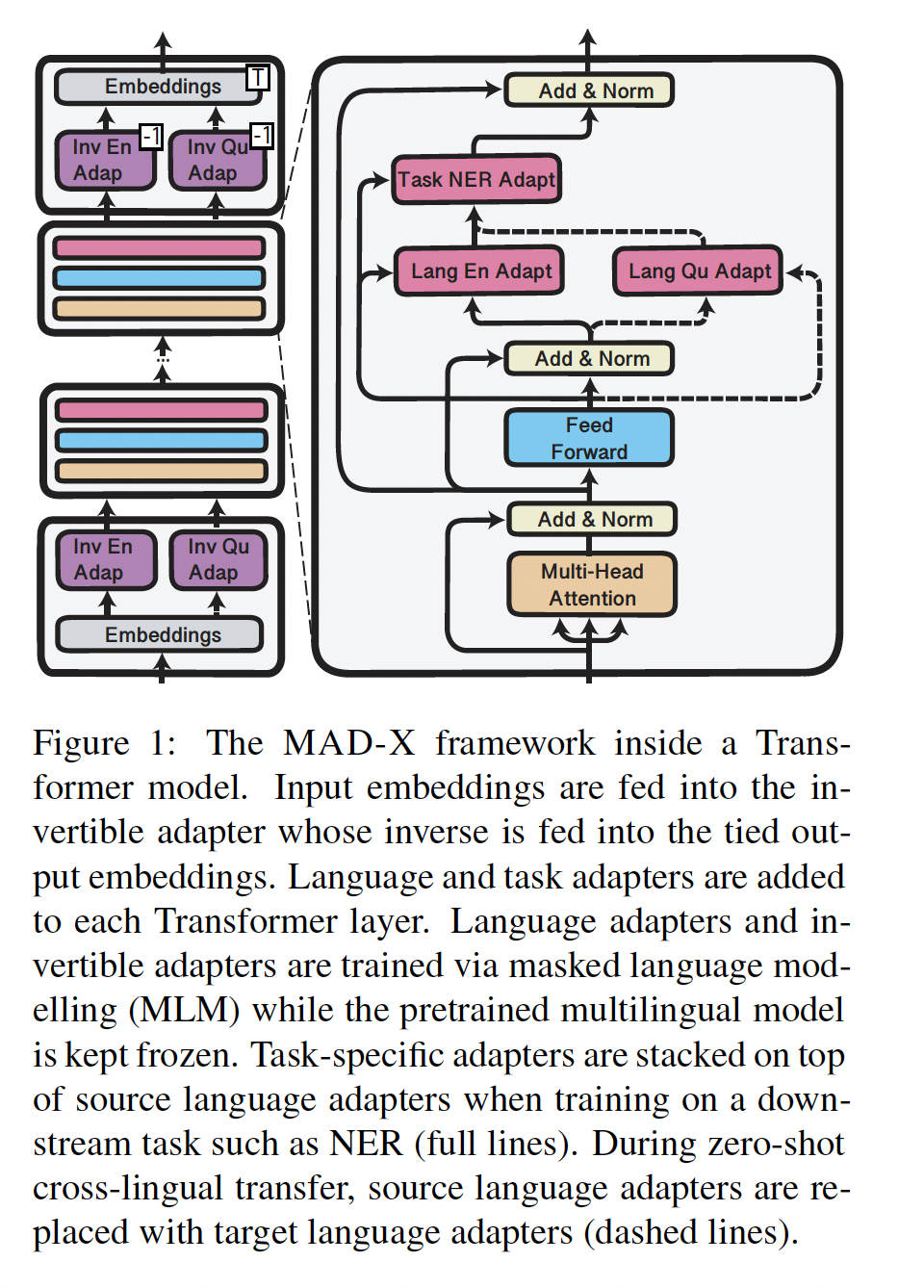 对于 MAD-X 框架,除非另有说明,否则我们依赖 XLM-R Base 架构;我们评估 full MAD-X 、MAD-X without invertible adapters(–INV )、以及 MAD-X without language and invertible adapters(–LAD –INV )。我们在所有实验中使用 Transformers 库。