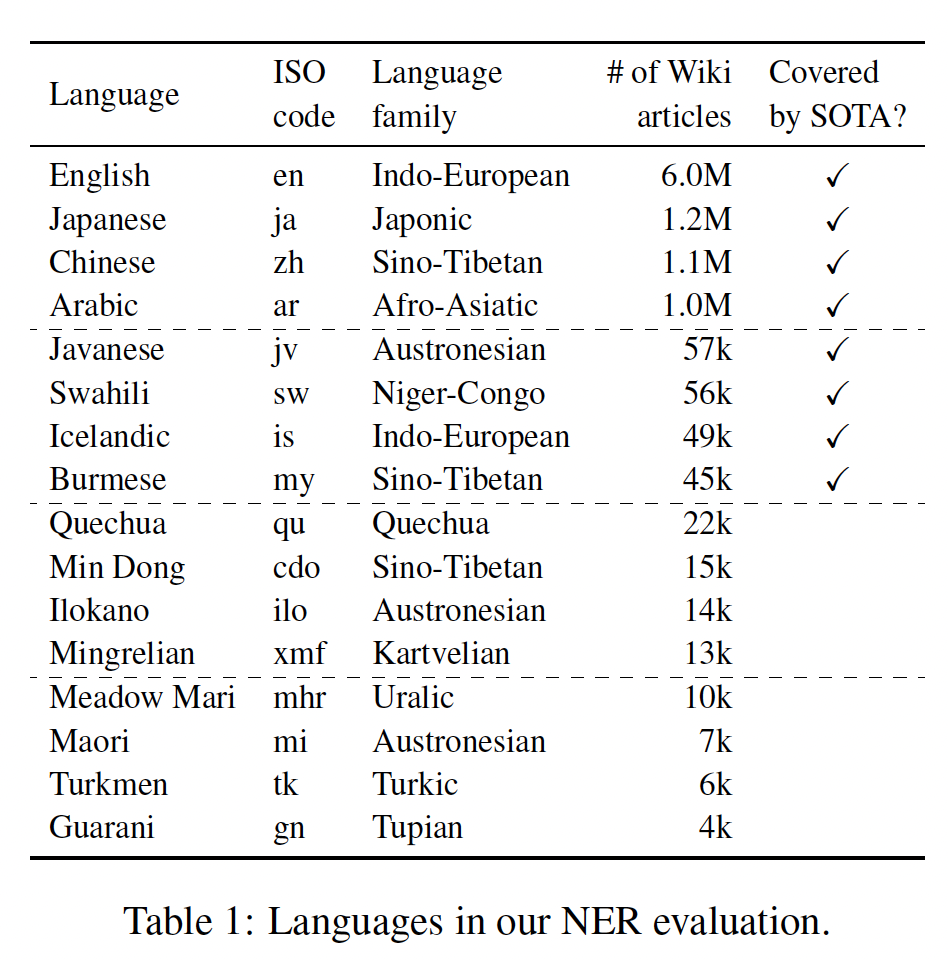 partitioned WikiANN 版本覆盖了 176 种语言。为了在不同的评估条件下与 SOTA 的跨语言方法进行全面比较,我们基于以下方面选择语言: