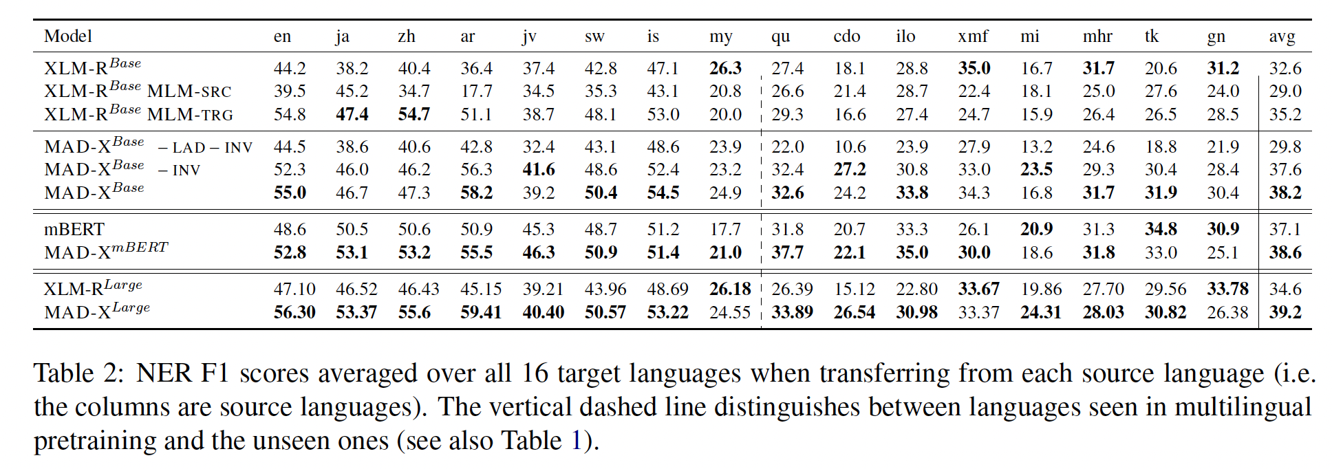为了展示我们的框架与模型无关,我们还将 XLM-R_Large 和 mBERT 作为 MAD-X 的 base model ,结果如 Table 2 所示。即使在更强的 base pretrained models 上,MAD-X 也显示了一致的改进。