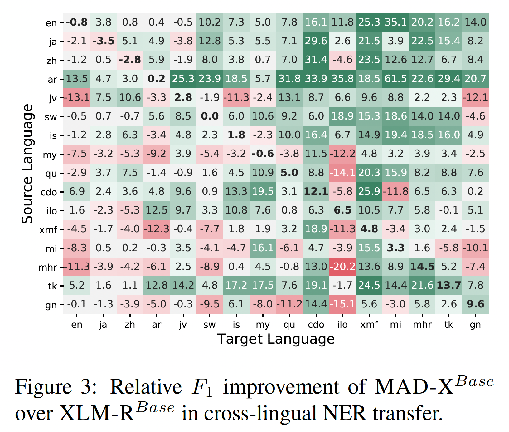 Impact of Invertible Adapters:在 NER 数据集上每个 language–target language pair ,我们还分析了MAD-X with invertible adapters 和 MAD-X without invertible adapters 的相对性能差异(见附录 D )。invertible adapters 提高了许多 transfer pairs 的性能,特别是在向低资源语言迁移时。只有以一个低资源语言作为源语言(毛利语)时,性能始终较低,可能是由于数据的 variation 。