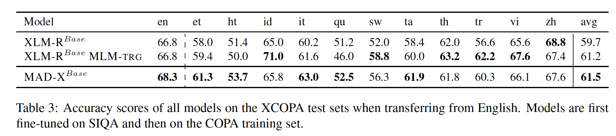 Causal Commonsense Reasoning:我们在 Table 3 中显示了在 XCOPA 上从英语向每个目标语言迁移的结果。为简洁起见,我们仅显示 《XCOPA: A Multilingual Dataset for Causal Commonsense Reasoning》 的最佳微调设置的结果,首先在 SIQA 上微调,然后在英语 COPA 训练集上微调;其他可能的设置的报告在附录中。