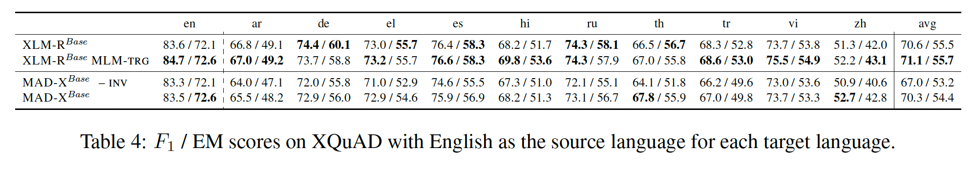 对于 QA ,我们在英语 SQuAD 训练集上进行了三次微调训练,评估所有XQuAD 目标语言,并报告平均 F1 分数和完全匹配(exact match: EM)分数。
