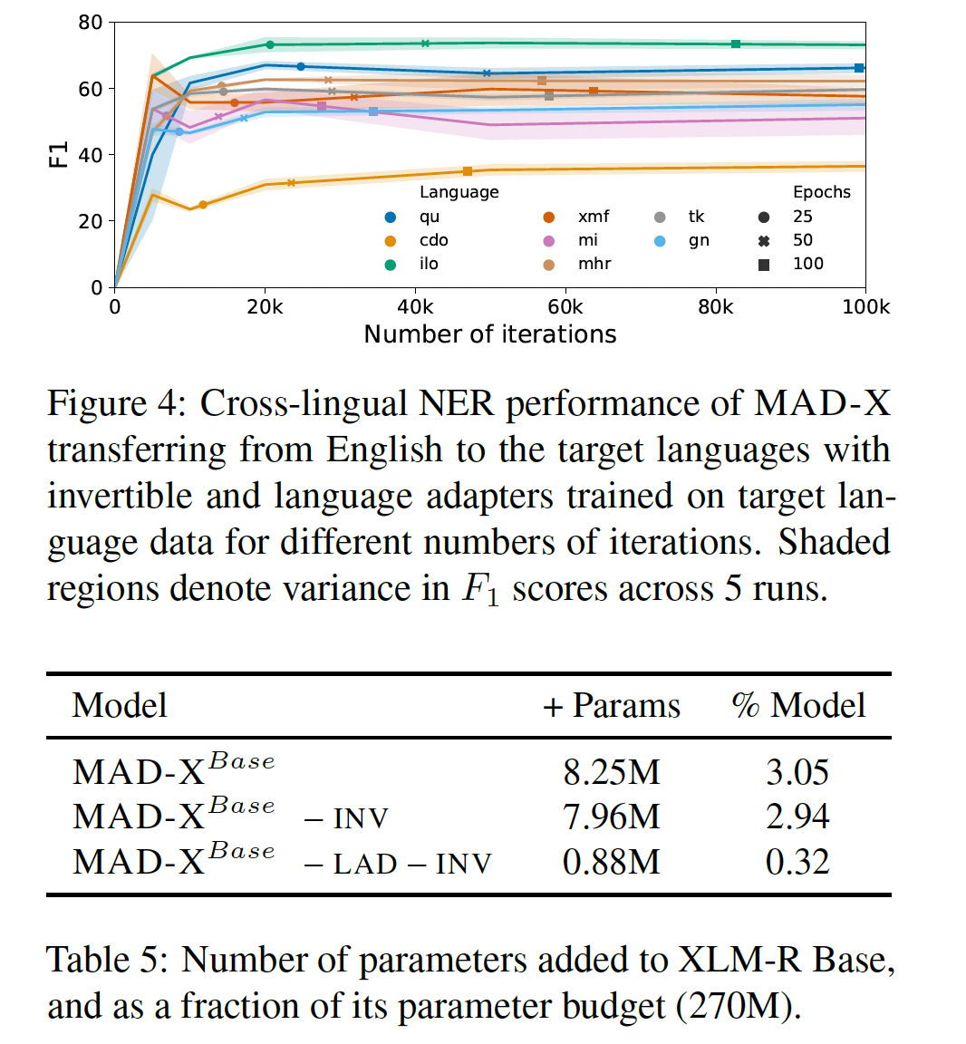 Sample Efficiency:MAD-X 的主要 adaptation bottleneck 是训练 language adapters 和 invertible adapters 。但是,由于 MAD-X 的模块化,一旦训练好,这些 adapters 就可以被直接重用(即 “即插即用”),可以跨不同任务。为了估计 adapter training 的样本效率,我们在几种低资源目标语言上(从英语作为源语言迁移时)衡量 NER 性能与训练迭代次数的关系。结果如 Figure 4 所示。结果显示,在 20k 次训练迭代中,我们就可以对低资源语言获得较强的性能,而更长的训练只提供了较小的性能提升。