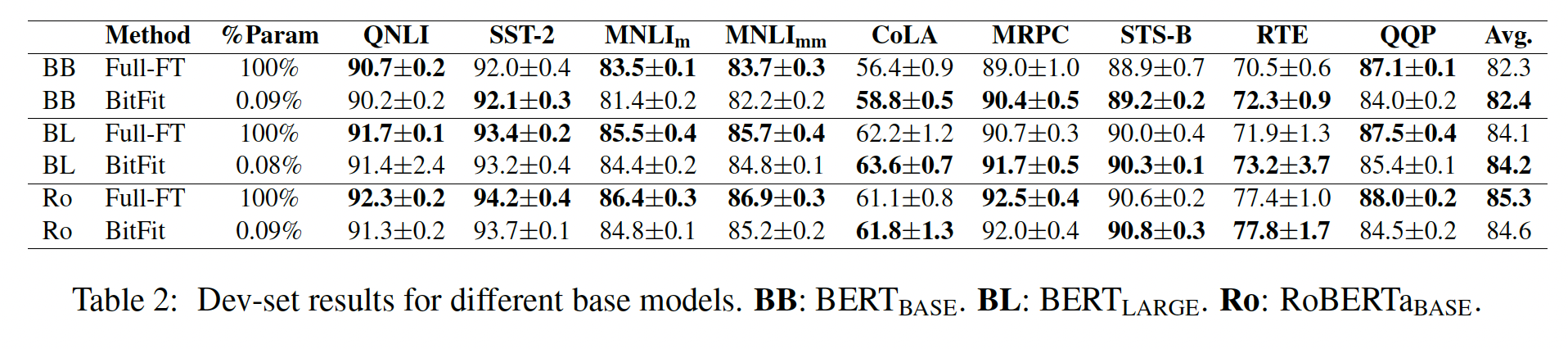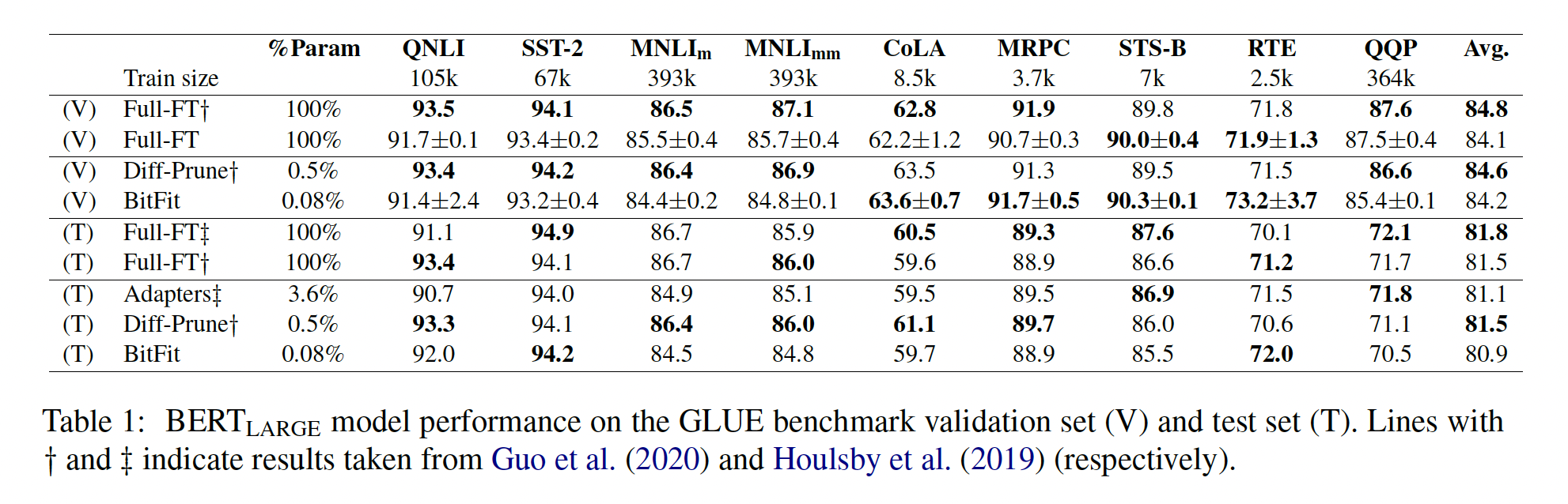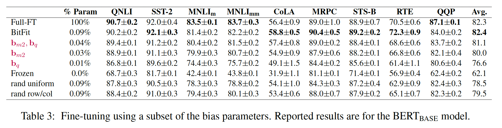 BitFit (《Bitfit: Simple parameter-efficient fine-tuning for transformer-based masked language-models》),只微调 pretrained 模型中的 bias 向量。