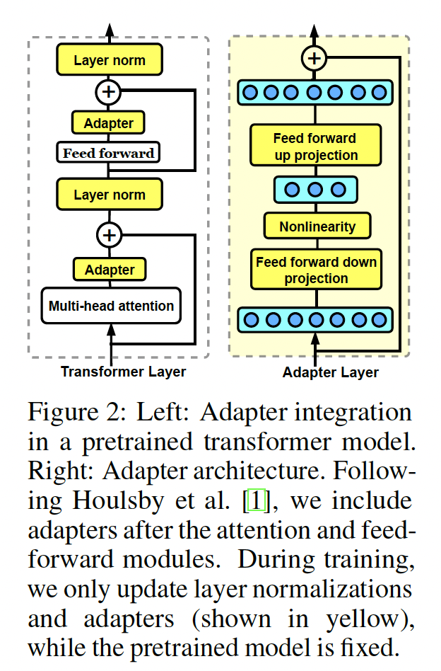transformer 模型的每一层主要由两个模块组成:一个 attention block 、一个 feed-forward block 。这两个模块之后都有一个 skip connection 。如 Figure 2 所示,《Parameter-efficient transfer learningfor nlp》建议在 skip connection 之前、在每个 block 之后插入一个 adapter layer 。