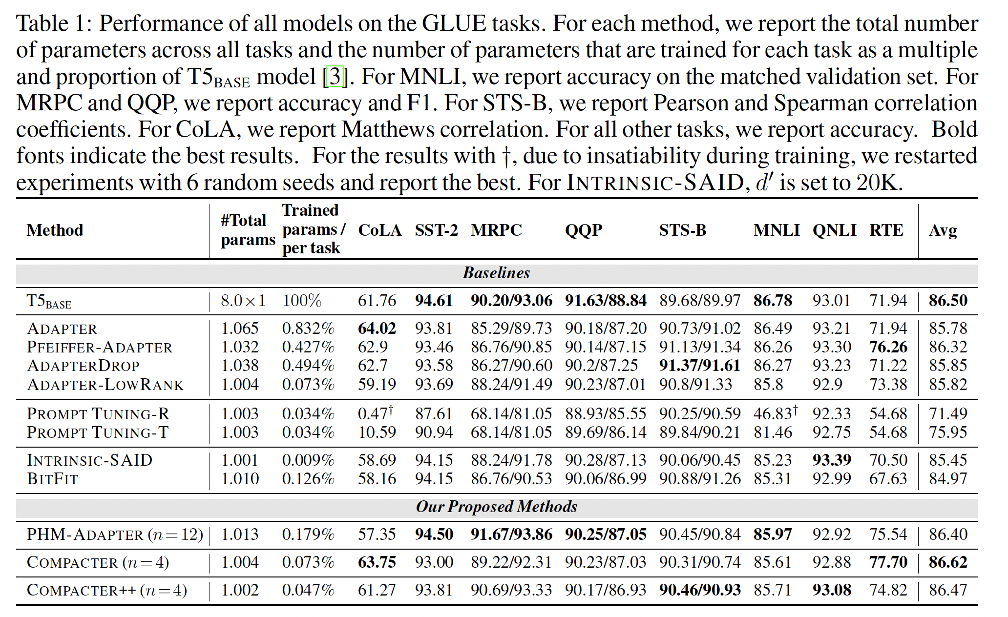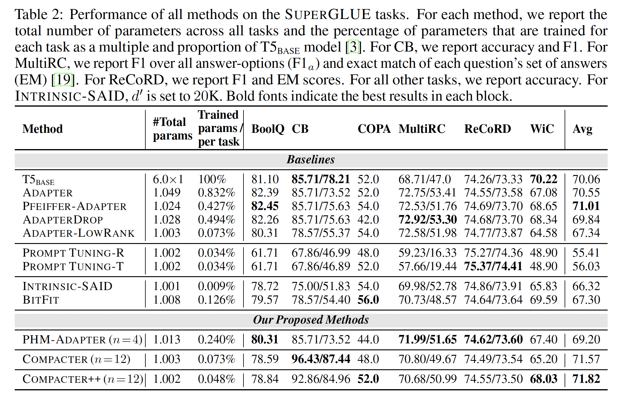2):我们证明 Compacter 在 GLUE 和 SuperGLUE 上获得了强大的经验性能。