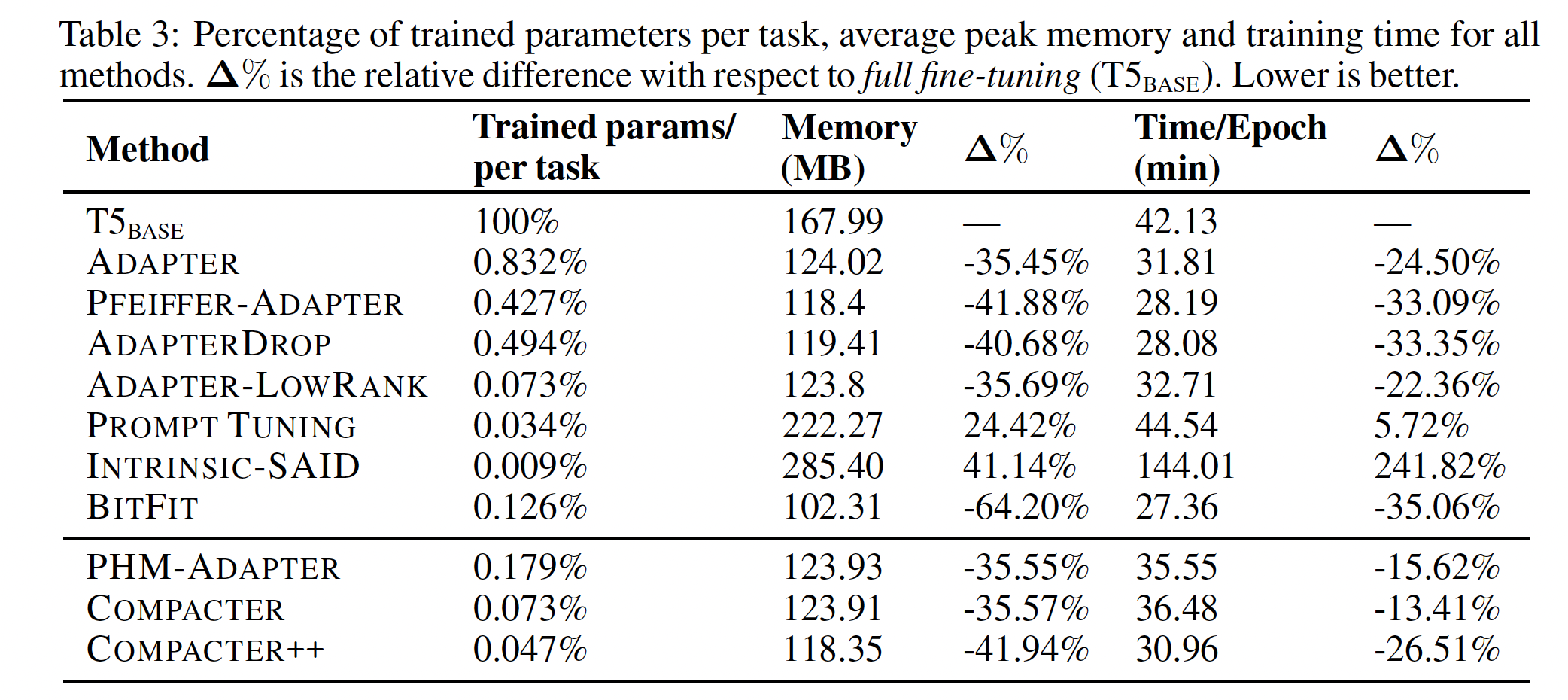 在 Compacter 中保持恒定,总共 PHM 和 adapter layers , 222M 参数的 T5_BASE 模型中,Compacter 仅学习了 0.047% 的参数,同时保持与 full fine-tuning 相当的性能。