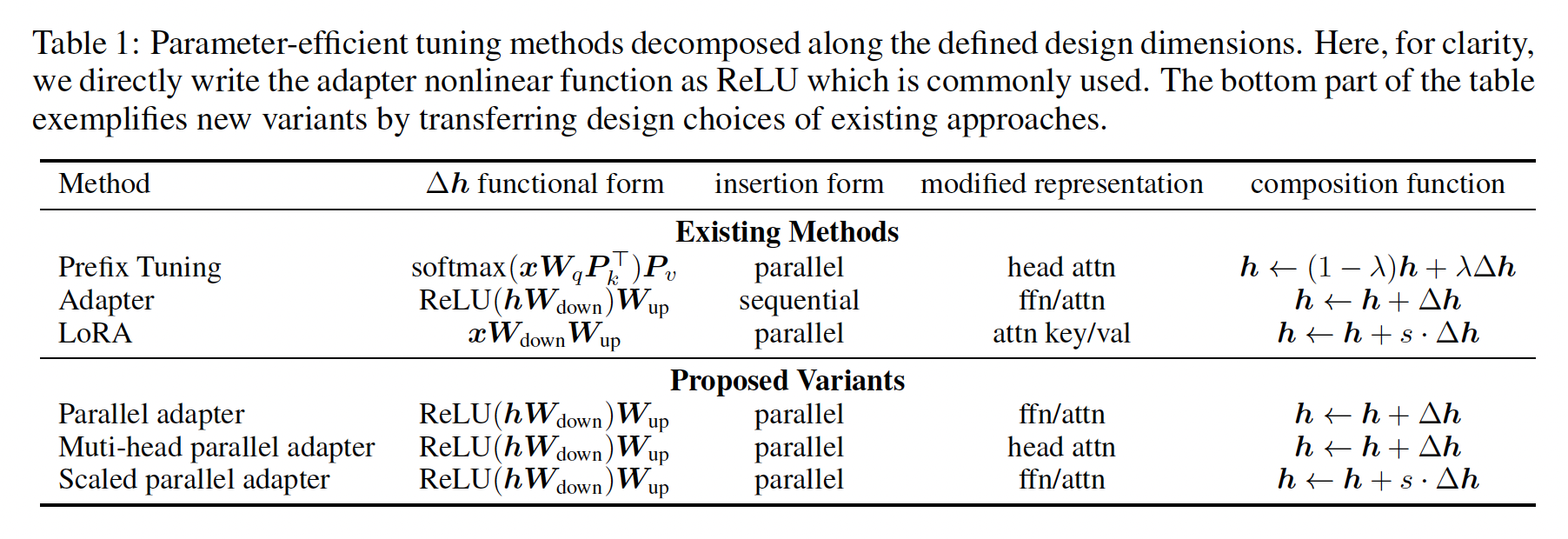 为描述这个 modification 过程,我们定义一组设计维度,不同方法可通过这些维度上的取值而实例化。我们下面详述这些设计维度,并展示 adapters 、prefix tuning 、LORA 在这些维度上的取值,如 Table 1 所示: