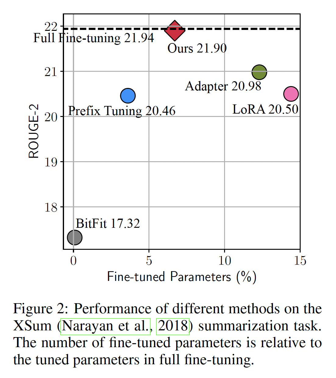 评估:我们在 XSum 测试集上报告 ROUGE 1/2/L 分数,在 en-ro 测试集上报告 BLEU 分数,在 MNLI 和 SST2 开发集上报告准确率。对于 MNLI 和SST2,我们取 5 次随机运行的中位数。我们还报告每个 parameter-efficient tuning 方法相对于 full fine-tuning 的参数数量(#params )。