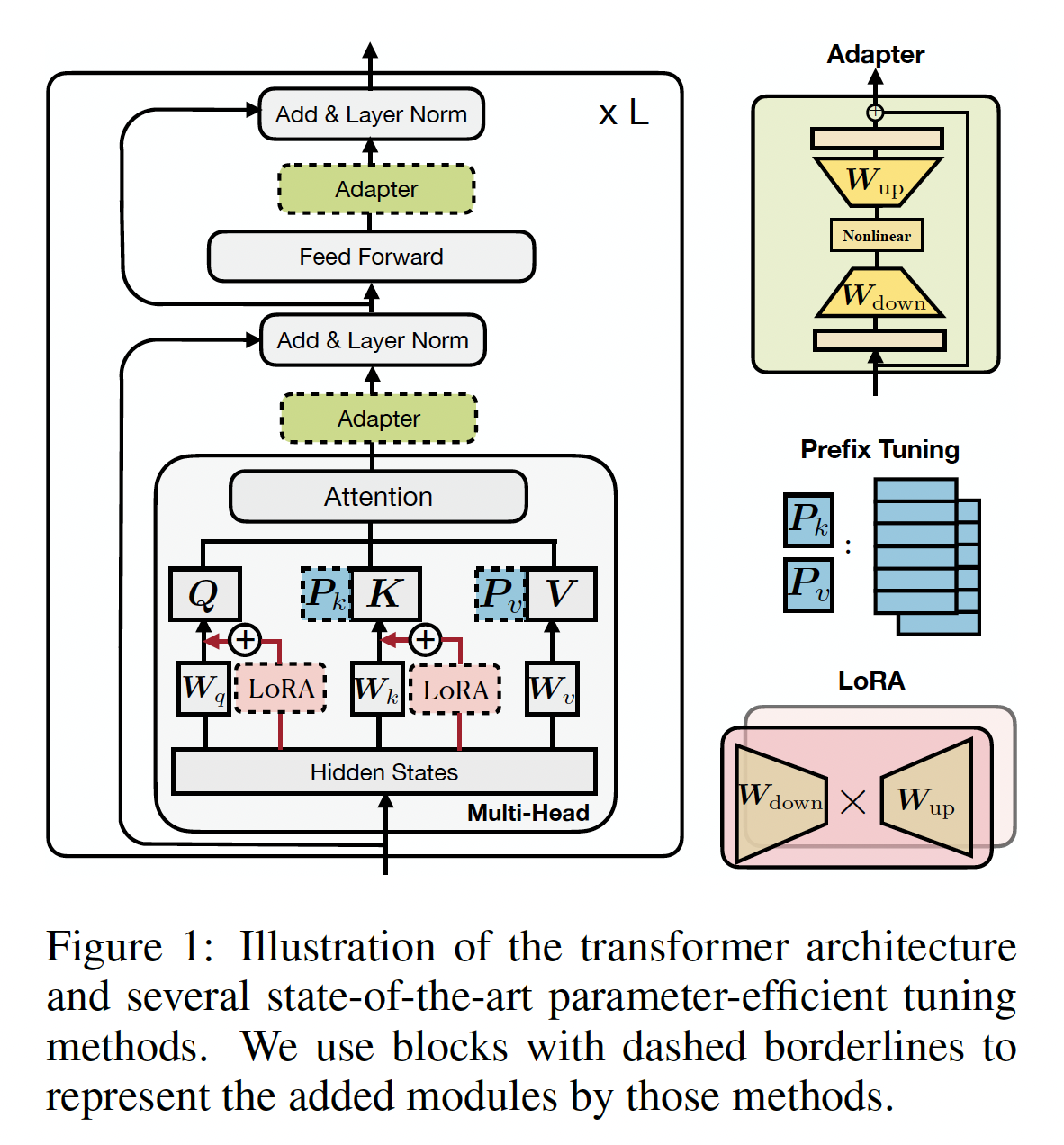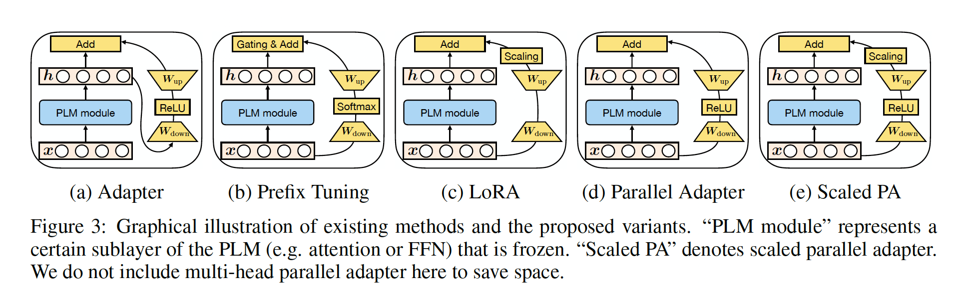 Composition Function:指向量 hidden representation hidden representation 。例如,adapters 执行简单的加法组合,prefix tuning 使用门控的加法组合,LORA 按常数因子缩放 hidden representation 上。
