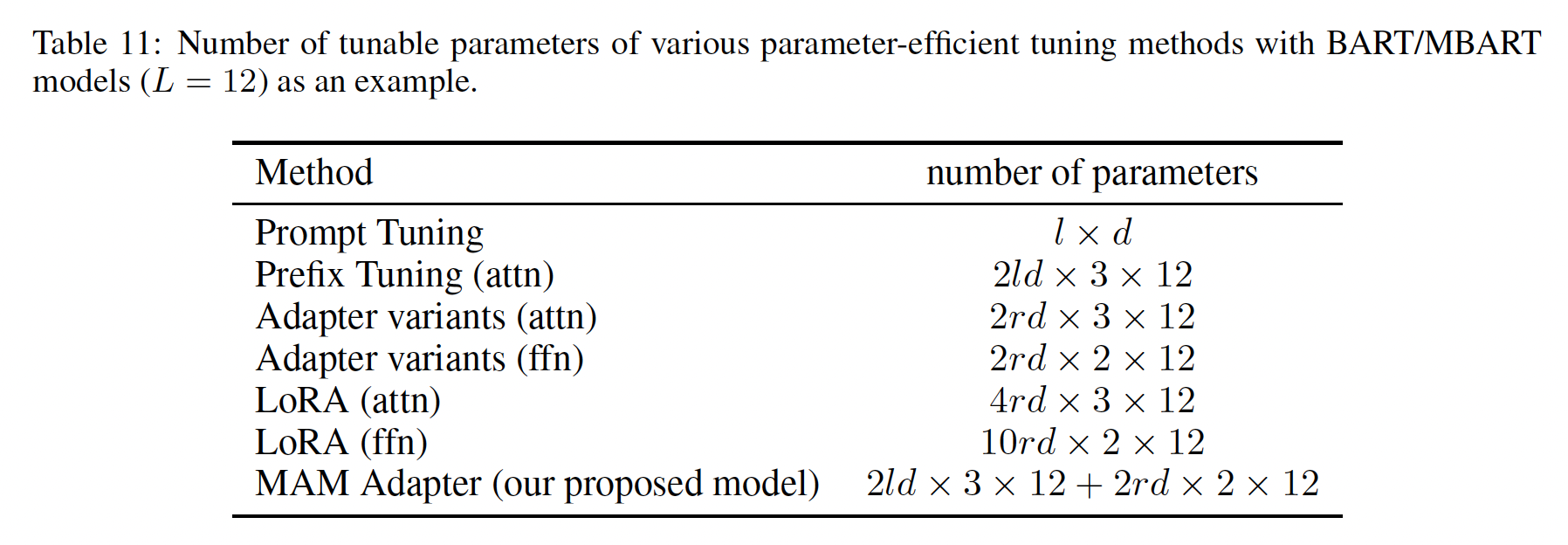 Tunable Parameters 的数量:BART 和 mBART 有 encoder-decoder 结构,有三种注意力:encoder self-attention、decoder self-attention、decoder cross-attention 。RoBERTa 只有 encoder self-attention。对于每个注意力子层,各方法使用的参数数量是: