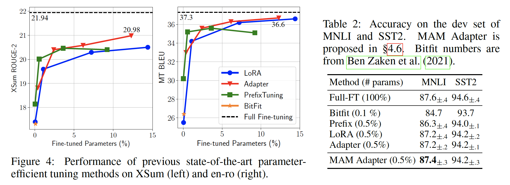 为完整起见,Table 6 中还呈现了其他组合版本的结果:同时在 attention layers 和 FFN layers 使用 parallel adapters 、以及把 prefix tuning(attn) 和 LORA(ffn) 组合起来。这两个组合版本都能改进它们各自的原型。然而,MAM Adapter 在两个任务上都达到了 SOTA ,只更新 pre-trained parameters 的 6.7% 就能匹配我们的 full fine-tuning 结果。在 Table 2 中,我们也呈现了MAM Adapter 在 MNLI 和SST2 上的结果,其中 MAM Adapter 通过添加 0.5% 的 pretrained parameters 达到了与 full fine-tuning 媲美的结果。