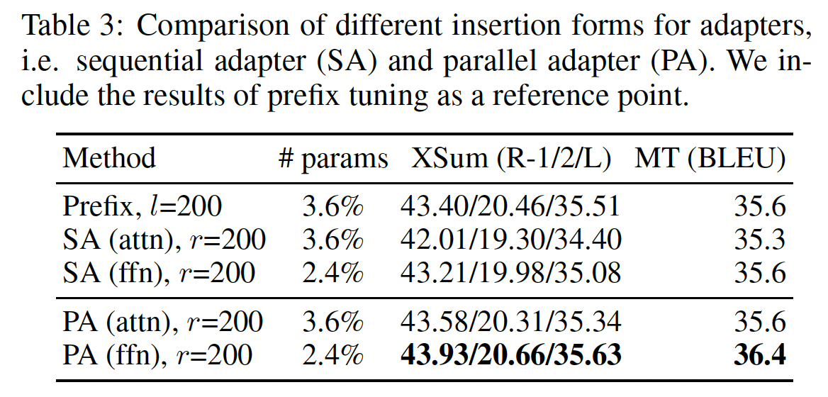 我们首先研究插入形式这个设计维度,比较所提出的 parallel adapter: PA 变体与传统的 sequential adapter: SA,进行 attention modification 或者 FFN modification 。我们还以 prefix tuning 为参考。如 Table 3 所示: