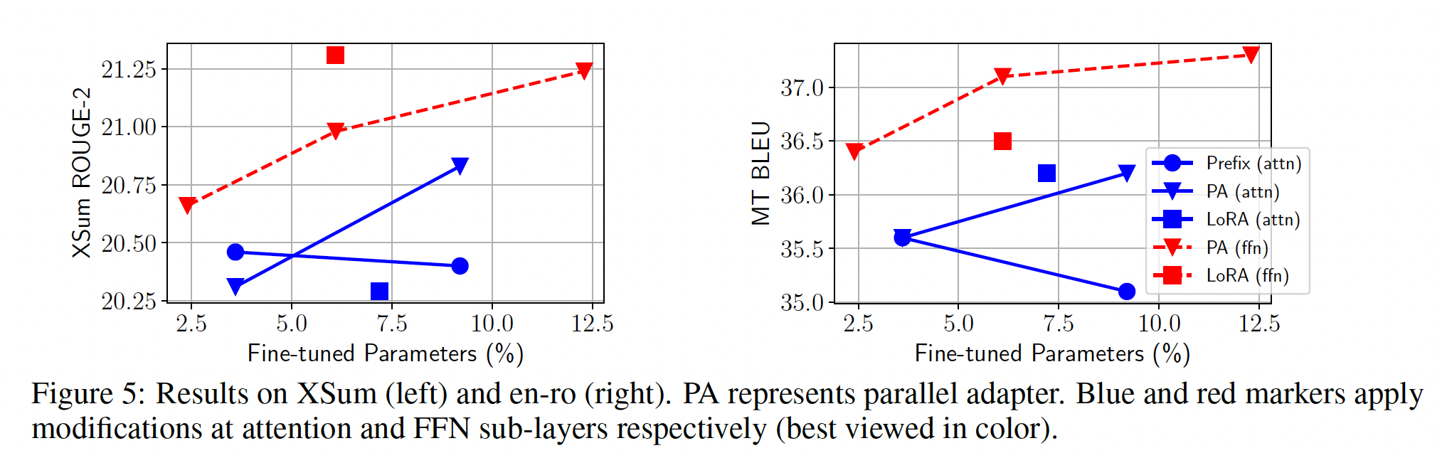 此外,parallel adapter 在所有情况下都优于 sequential adapter ,其中 PA(ffn) 在 XSum 上分别超过 SA(ffn) 1.7 R-2 分,在 en-ro上超过 0.8 BLEU 分。