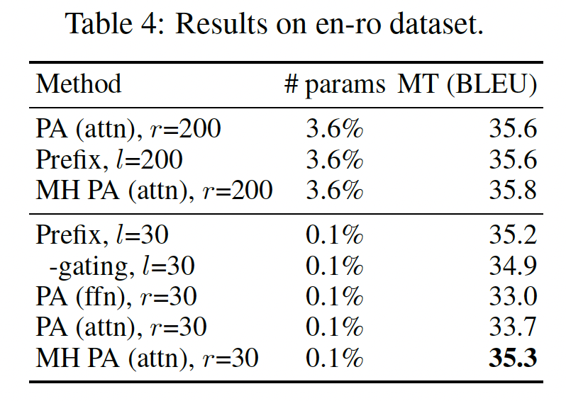 在使用 0.1% 参数时,多头方法(即,prefix tuning 和 MH PA(attn) 优于所有其他方法至少 1.6 BLEU 分。