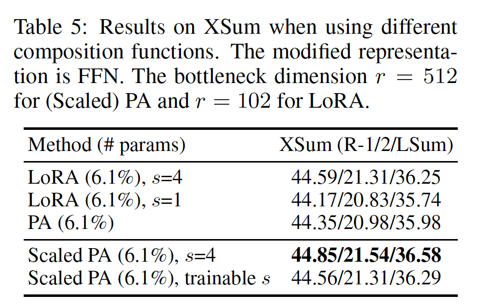 Table 5 报告了在 XSum 上的结果。我们将 adapter 的 512 、LORA 的 102 ,以使它们的 tuned parameters 数量相同。我们根据开发集的 R-2 score 选择 LORA(s=4) 优于 parallel adapter 。但是,如果我们通过设置 LORA 的组合函数插入到 parallel adapter ,产生的 Scaled PA 相比原始 parallel adapter 提高了 0.56 ROUGE-2 分。我们也尝试了可学习的标量,但没有更好的结果。因此,我们得出结论:scaling composition function 优于普通的 additive composition function,而且易于应用。