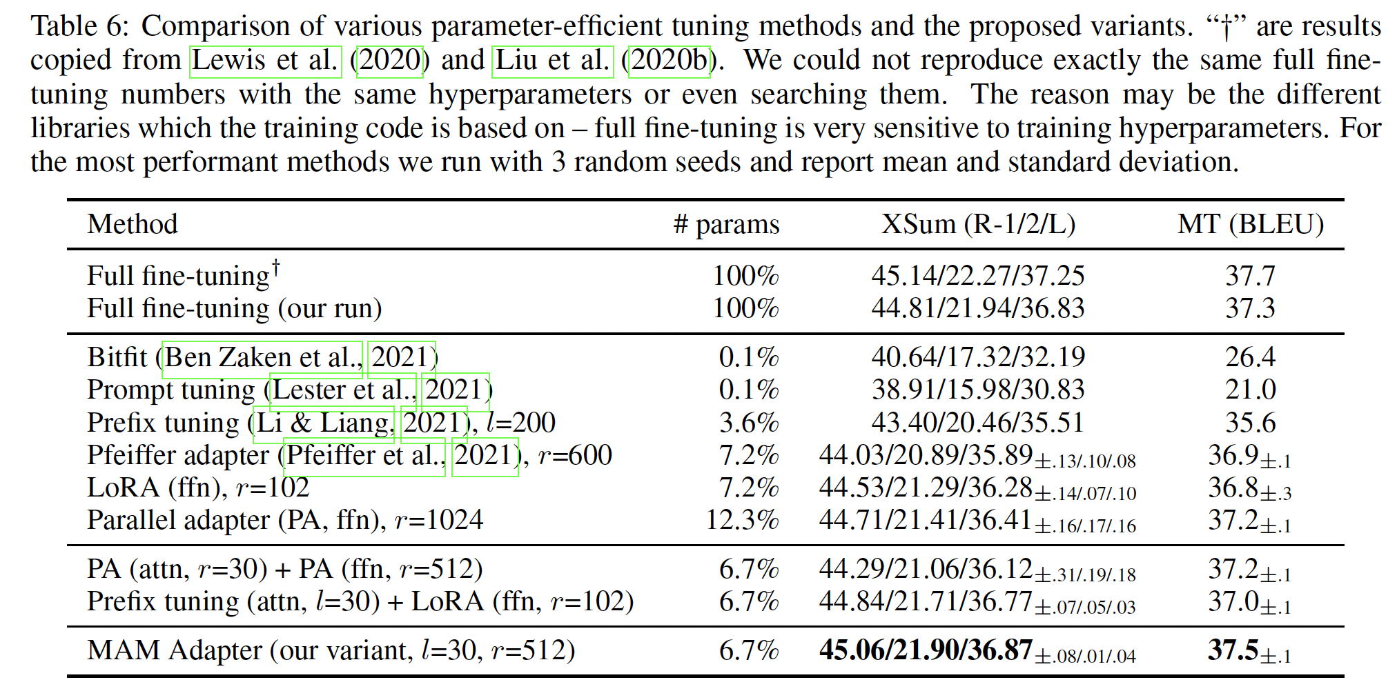 受其启发,我们组合这些有利的设计。具体而言,我们在 attention sub-layers 使用具有 small bottleneck dimension prefix tuning,并分配更多参数预算使用 scaled parallel adapter (FFN representation 。由于 prefix tuning 在我们的统一框架中可以看作是 adapter 的一种形式,我们将这个变体称为 Mix-And-Match adapter: MAM Adapter 。在 Table 6 中,我们将 MAM adapter 与各种 parameter-efficient tuning 方法进行比较。