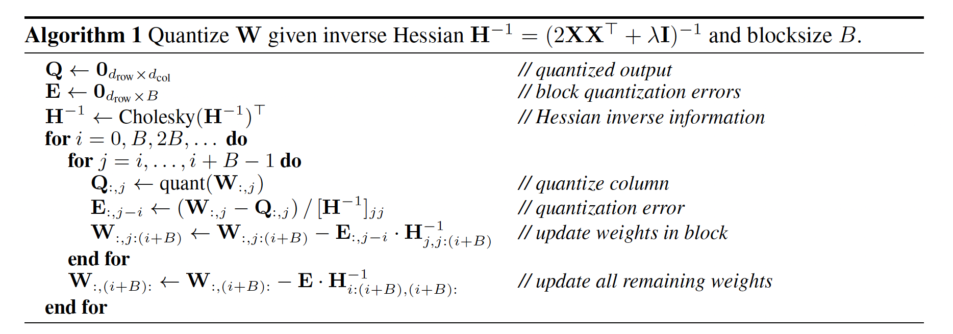 完整算法:最后,我们在 Algorithm 1 中给出 GPTQ 的完整伪代码,包括上面讨论的优化。