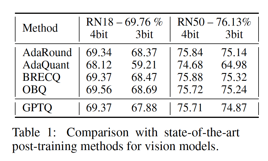 Quantizing Small Models:作为第一个消融研究,我们在 ResNet18 和 ResNet50 上比较 GPTQ 与 SOTA 的 post-training quantization: PTQ 方法的性能,这些是标准的 PTQ benchmarks ,设置与 《Optimal Brain Compression: A framework for accurate post-training quantization and pruning》 相同。