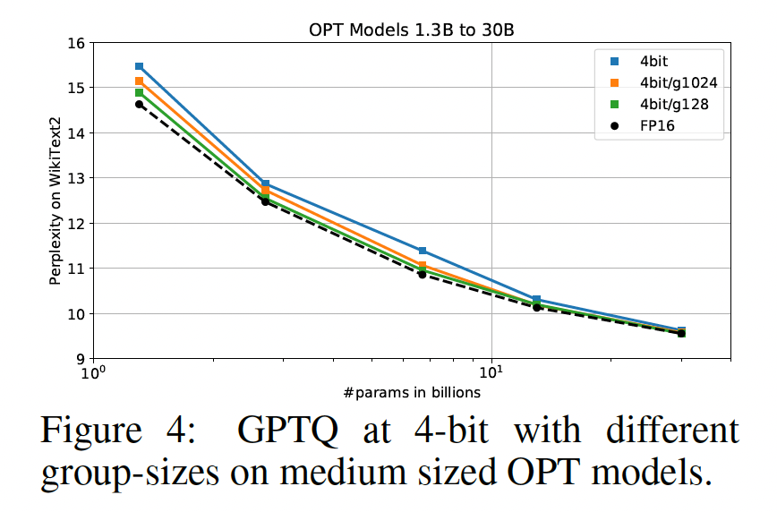 Additional Tricks:虽然到目前为止我们的实验仅集中在普通的 row-wise quantization 上,但我们想强调 GPTQ 与基本上任何quantization grid choice 兼容。例如,它很容易与 standard grouping (《QSGD: Randomized quantization for communication-efficient stochastic gradient descent》、《nuQmm: Quantized matmul for efficient inference of large-scale generative language models》)相结合,即对 groups of g consecutive weights 应用独立的量化。如 Table 5 最后几行所示,这在 3-bit 对最大模型可以带来显着的额外准确率提升。此外,如 Figurer 4 所示,它显着减少了中等大小模型在 4-bit precision 下的准确率损失。
