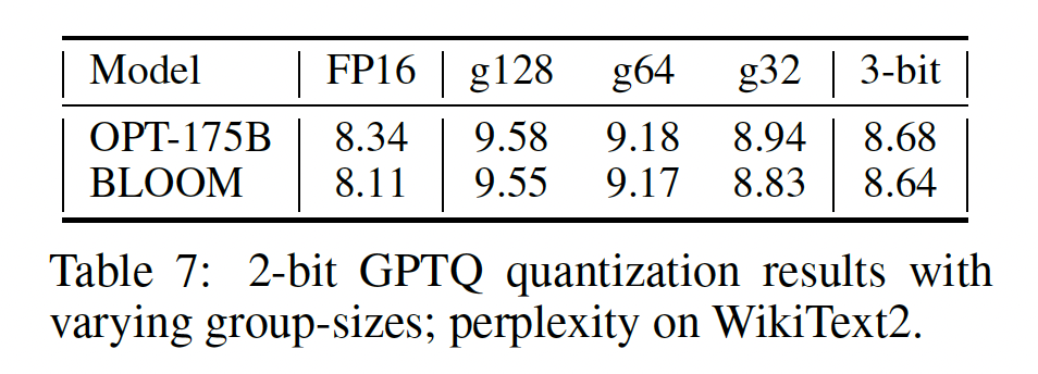 极端量化:最后,grouping 也使得在平均 2-bit per parameter 的极端量化上获得合理性能成为可能。Table 7 显示了在不同 group-size 下将最大模型量化为 2-bit 时在 WikiText2 上的结果。