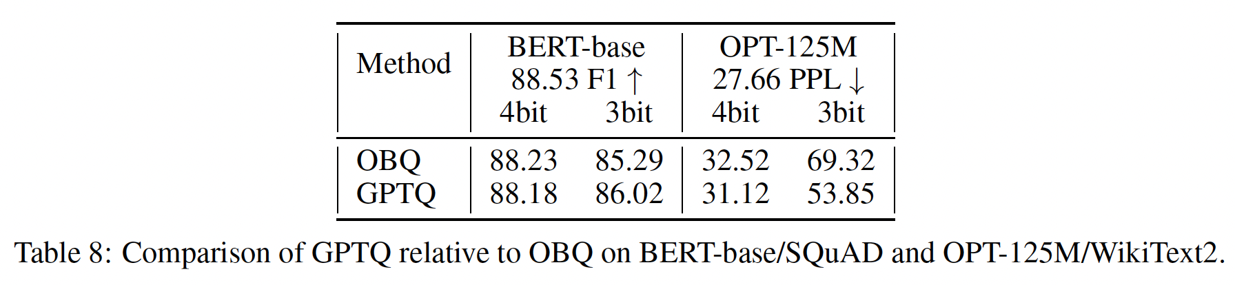 此外,我们还与两个小型语言模型 BERT-base 和 OPT-125M 上的 full greedy OBQ 方法进行了比较。结果如附录 Table 8 所示。可以看到:在 4-bit 时,两种方法的性能相似;在 3-bit 时,出人意料的是,GPTQ 的表现略好一些。我们怀疑这是因为 OBQ 使用的一些额外启发式方法,如 early outlier rounding ,可能需要仔细调整从而在 non-vision 模型上获得最佳性能。