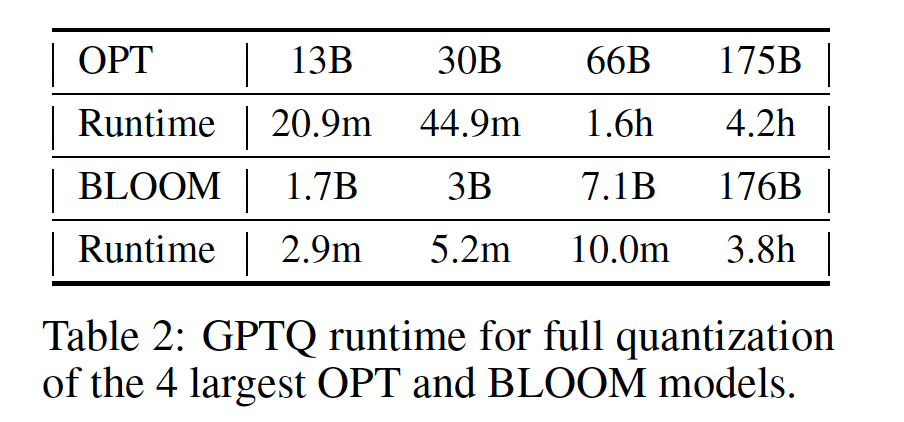 Runtime :接下来,我们通过 GPTQ 测量 full model quantization time (在单个 NVIDIA A100 GPU 上);结果如 Table 2 所示。可以看出: