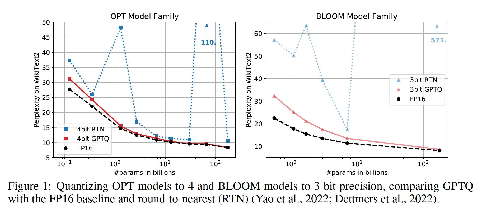 我们的主要基准线,记做 RTN ,将所有权重舍入到与 GPTQ 使用的完全相同的 asymmetric per-row grid 上的 nearest quantized value;这对应于 SOTA 的LLM.int8() 的 weight quantization 。这目前是非常大规模语言模型的量化中所有工作的选择方法:它的运行时间随着具有数十亿参数的网络很好地扩展,因为它只执行直接舍入(direct rounding )。