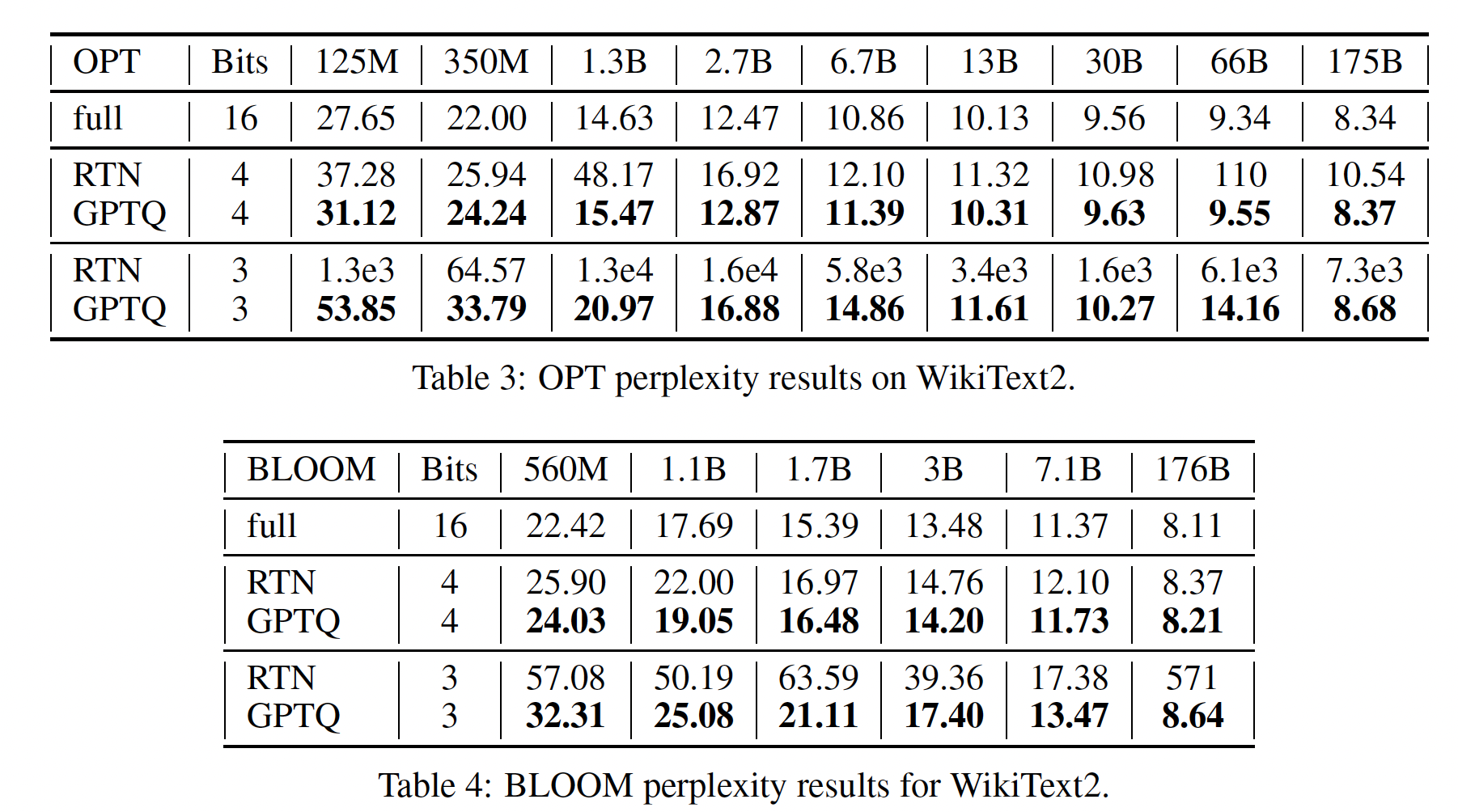在 3 比特下,RTN 完全崩溃,而 GPTQ 仍能维持合理的困惑度,特别是对较大的模型。