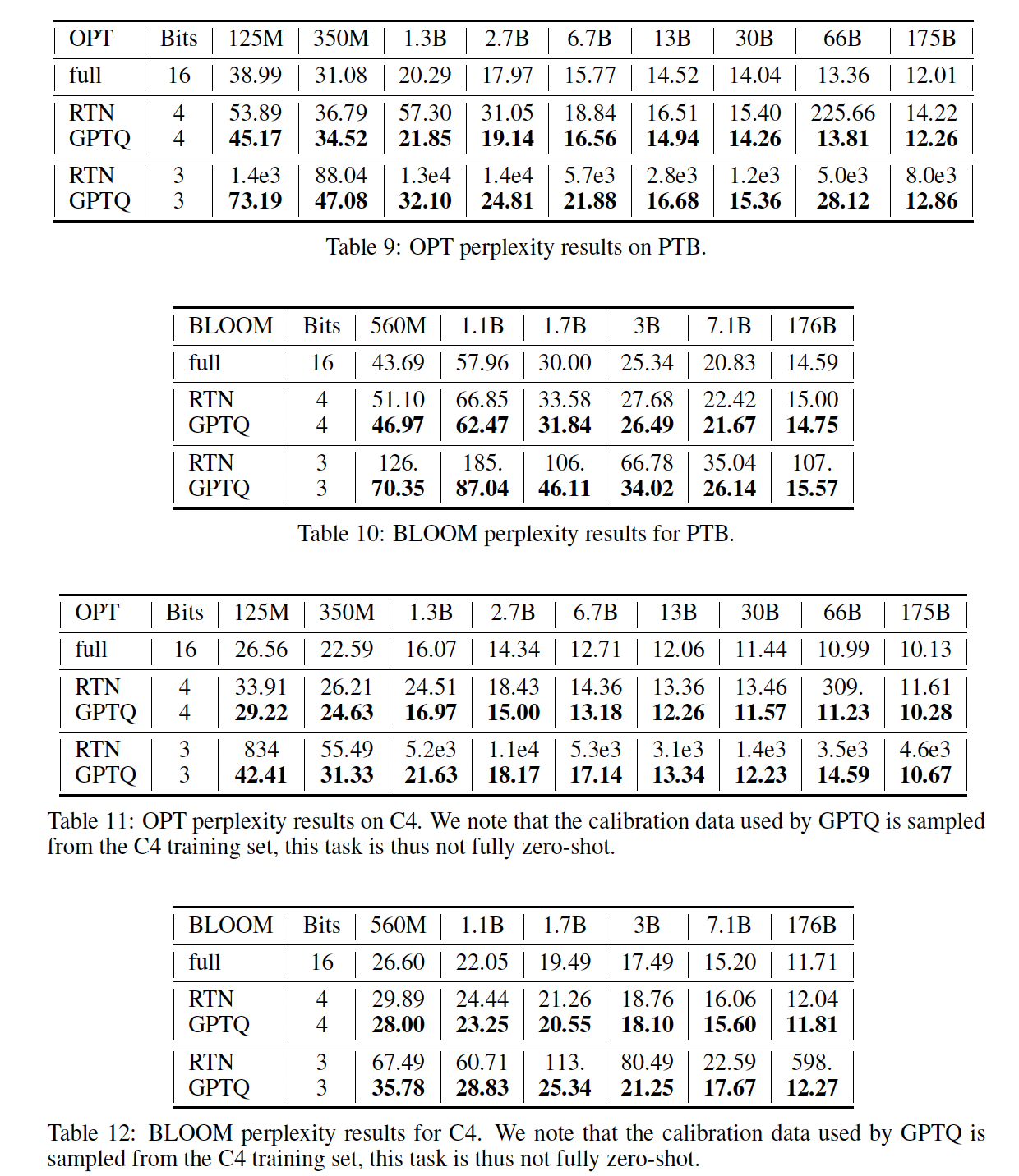 在 4-bit 下,GPTQ 模型的困惑度仅比 full-precision versions 低 OPT-175B 上以较大优势超越了 RTN 的结果。