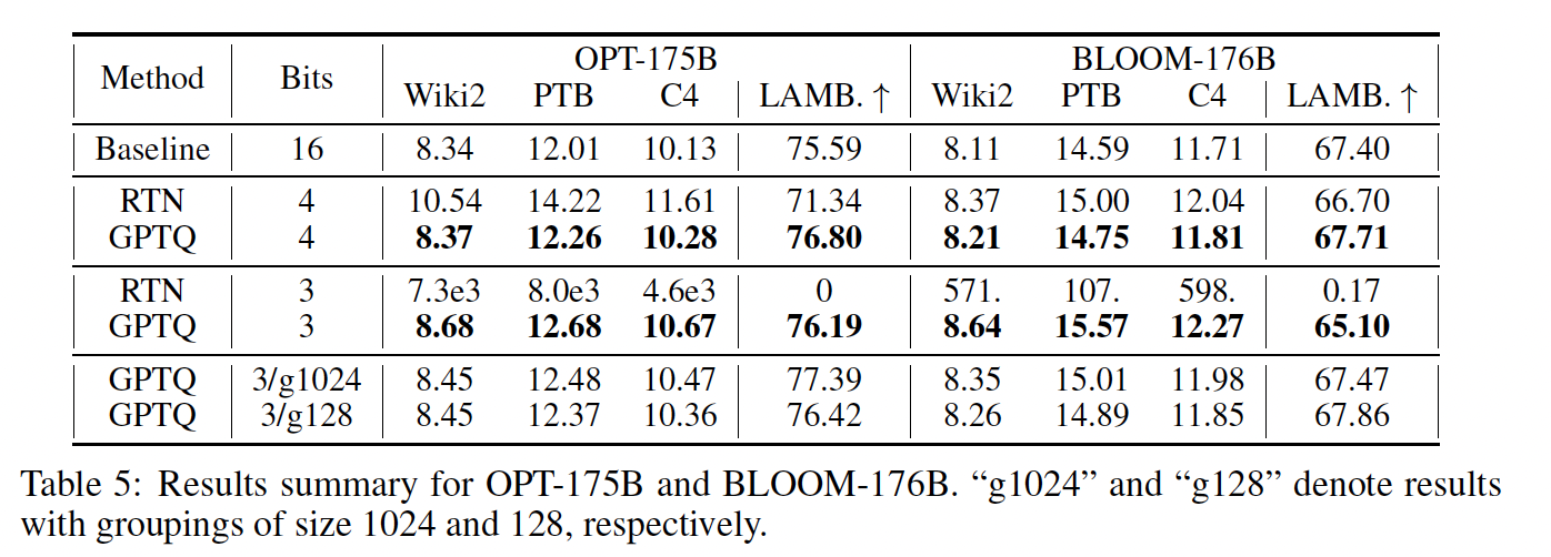 在 OPT 模型上,GPTQ 明显优于 RTN ,差距很大。例如,在 175B 参数模型的 4-bit 下,GPTQ只损失了 0.03 的困惑度,而RTN 下降了 2.2 的困惑度(甚至比规模小 10 倍的 full-precision 13B model 表现还差)。
