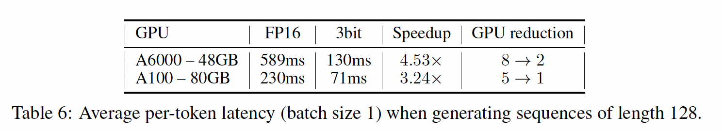 使用我们的 kernels ,通过 GPTQ 获得的 3-bit OPT-175B 模型在单 A100 GPU 上运行时,与 FP16 版本(在 5 个 GPU 上运行)相比,average time per token 快约 3.25 倍。