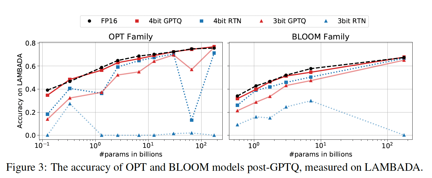 2) :在 3-bit ,RTN 崩溃 而 GPTQ 仍然提供良好的准确率。