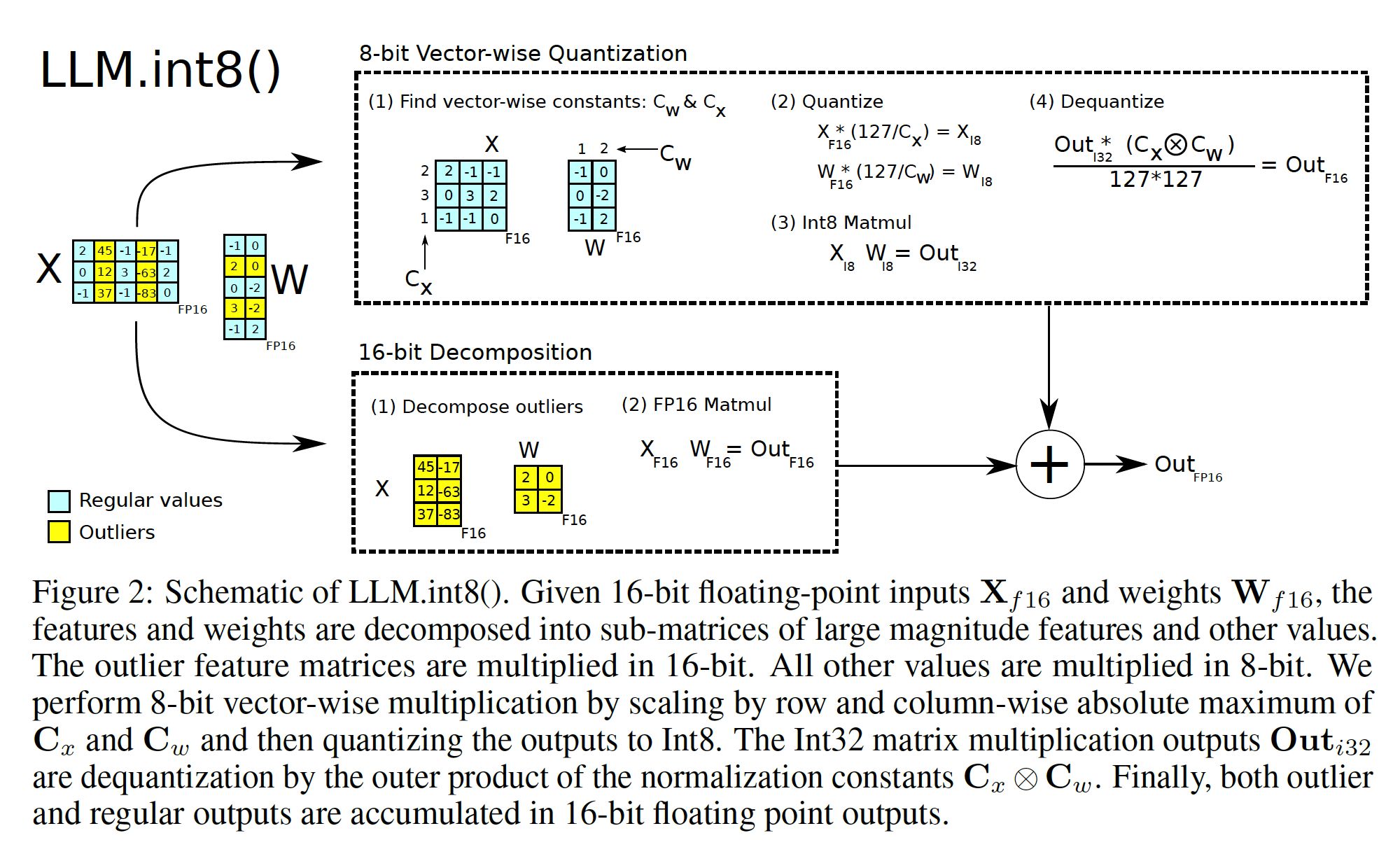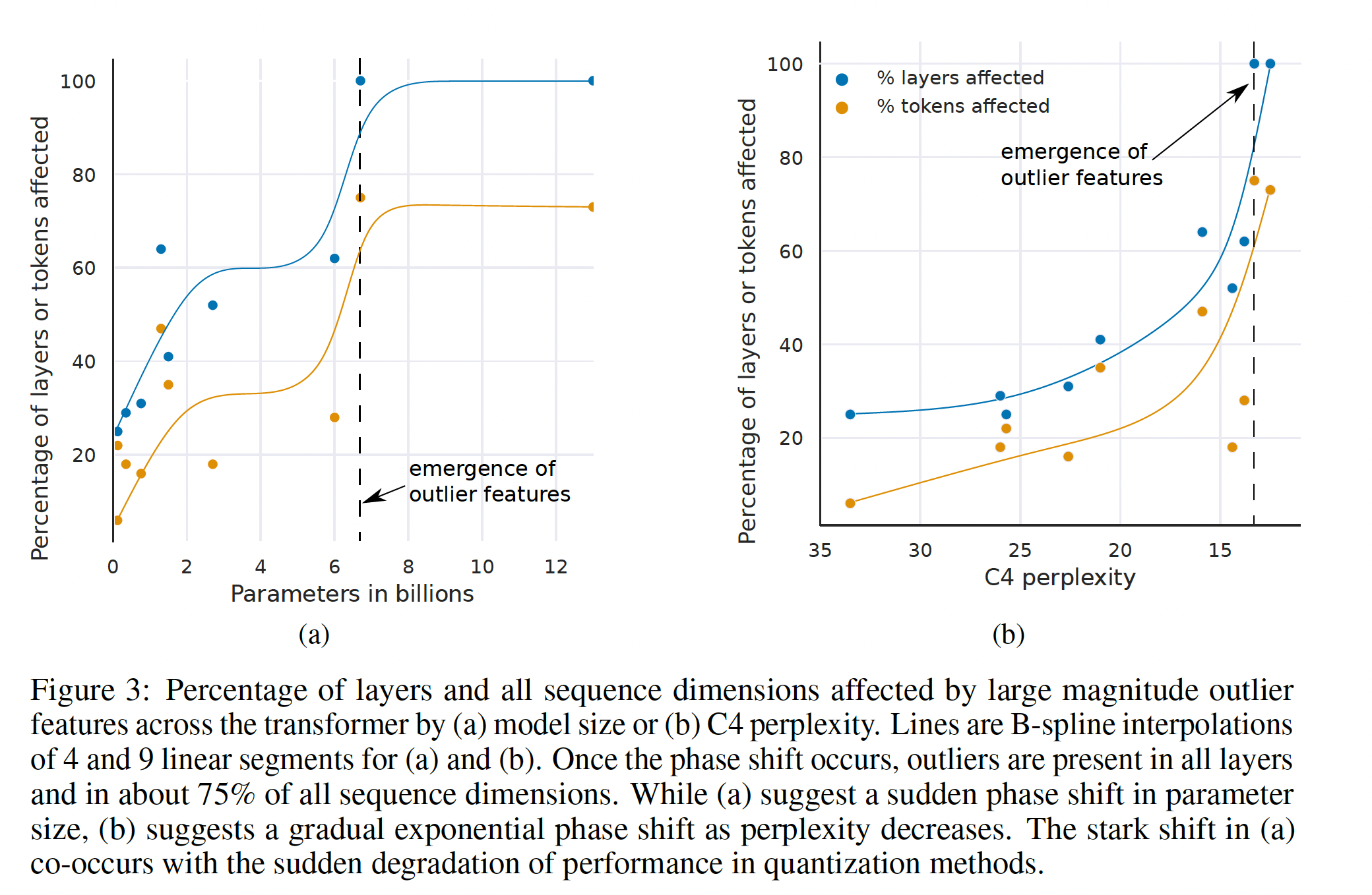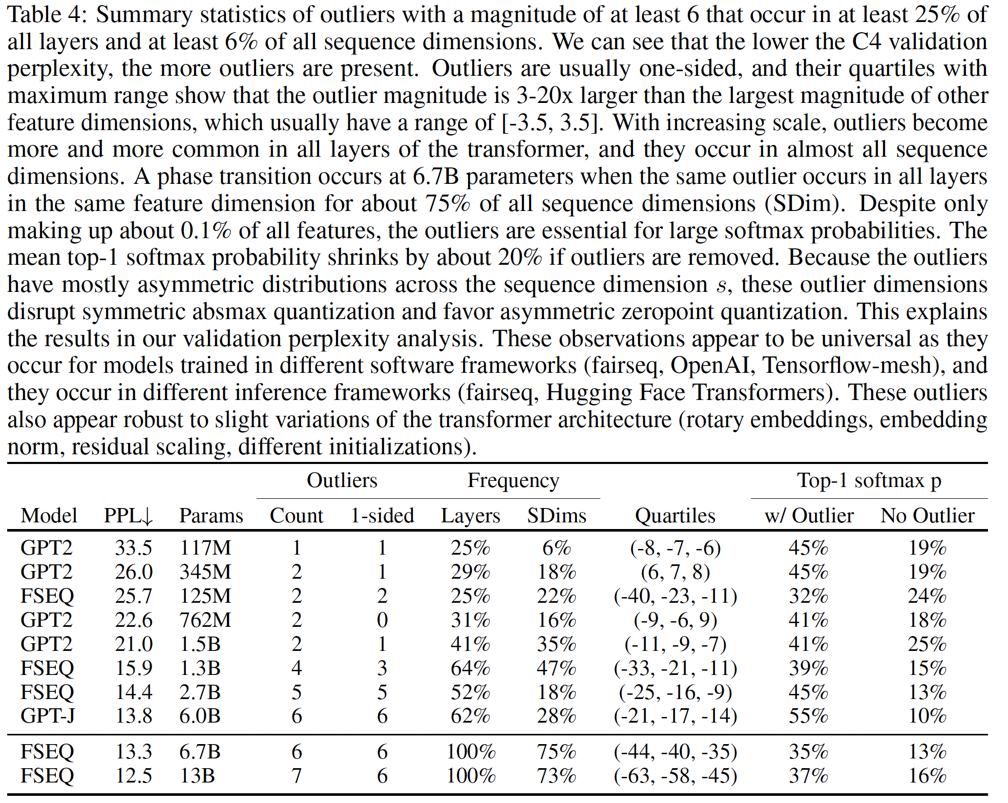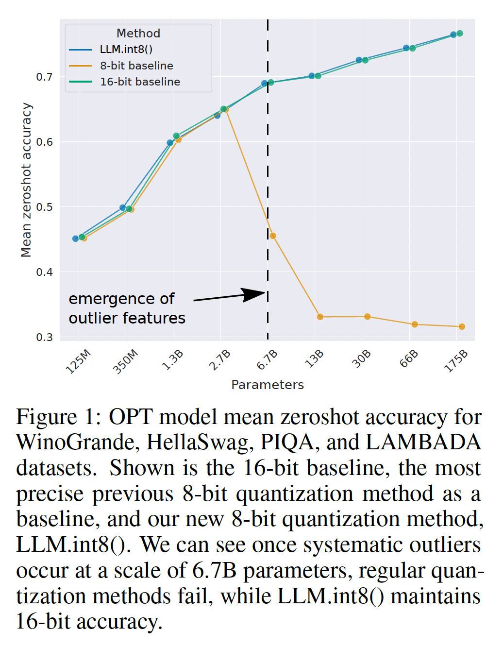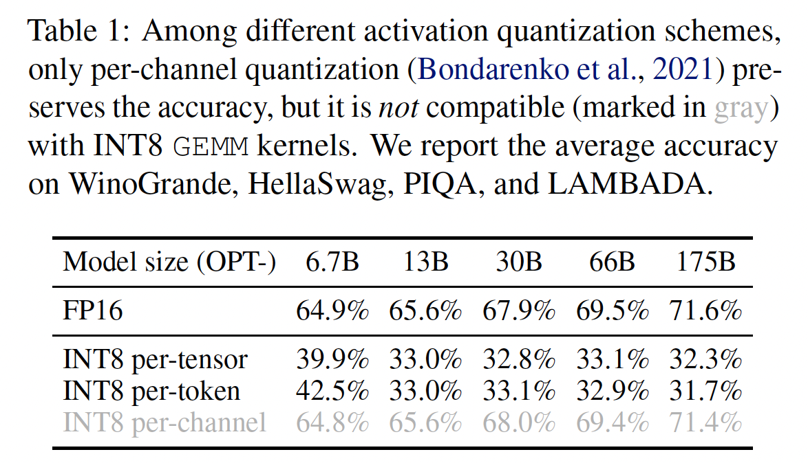 LLM.int8() 观察到在少数 feature dimensions 中的 activation outliers 会破坏更大模型的量化,并提出通过以更高的精度来保持这些维度从而来解决这个问题。