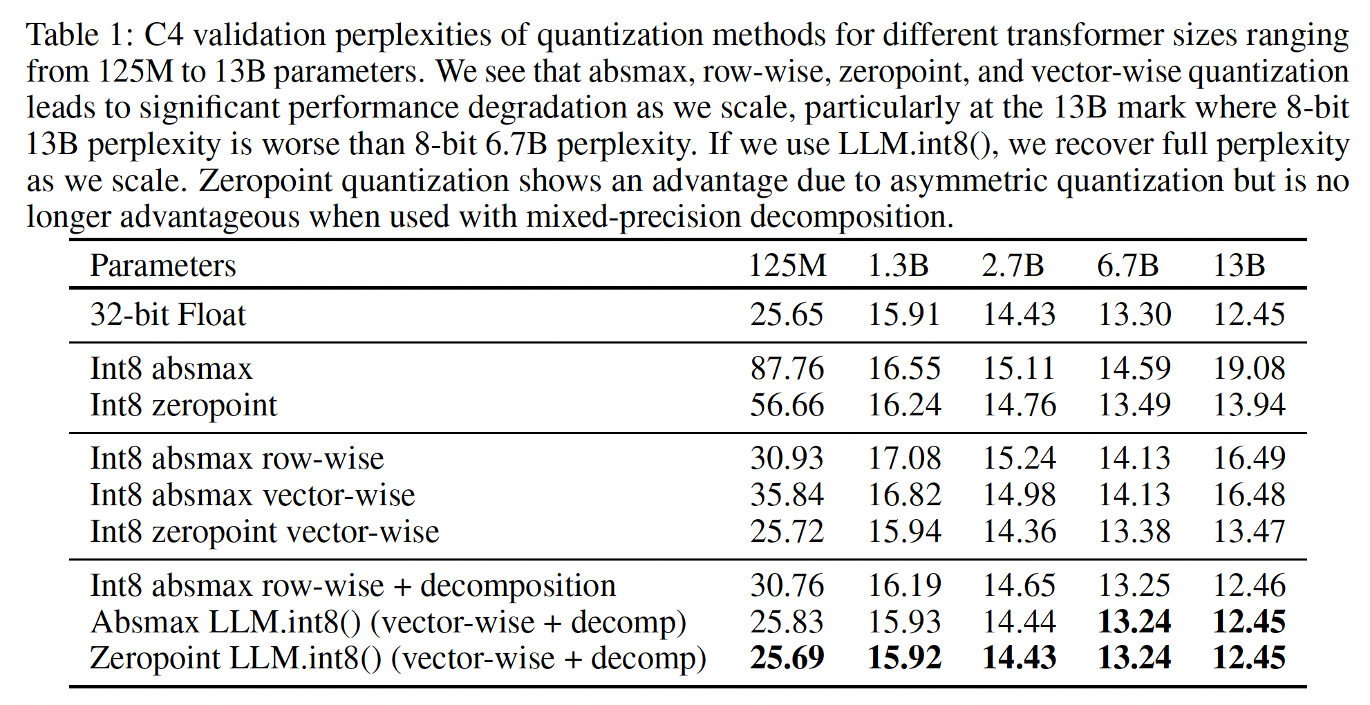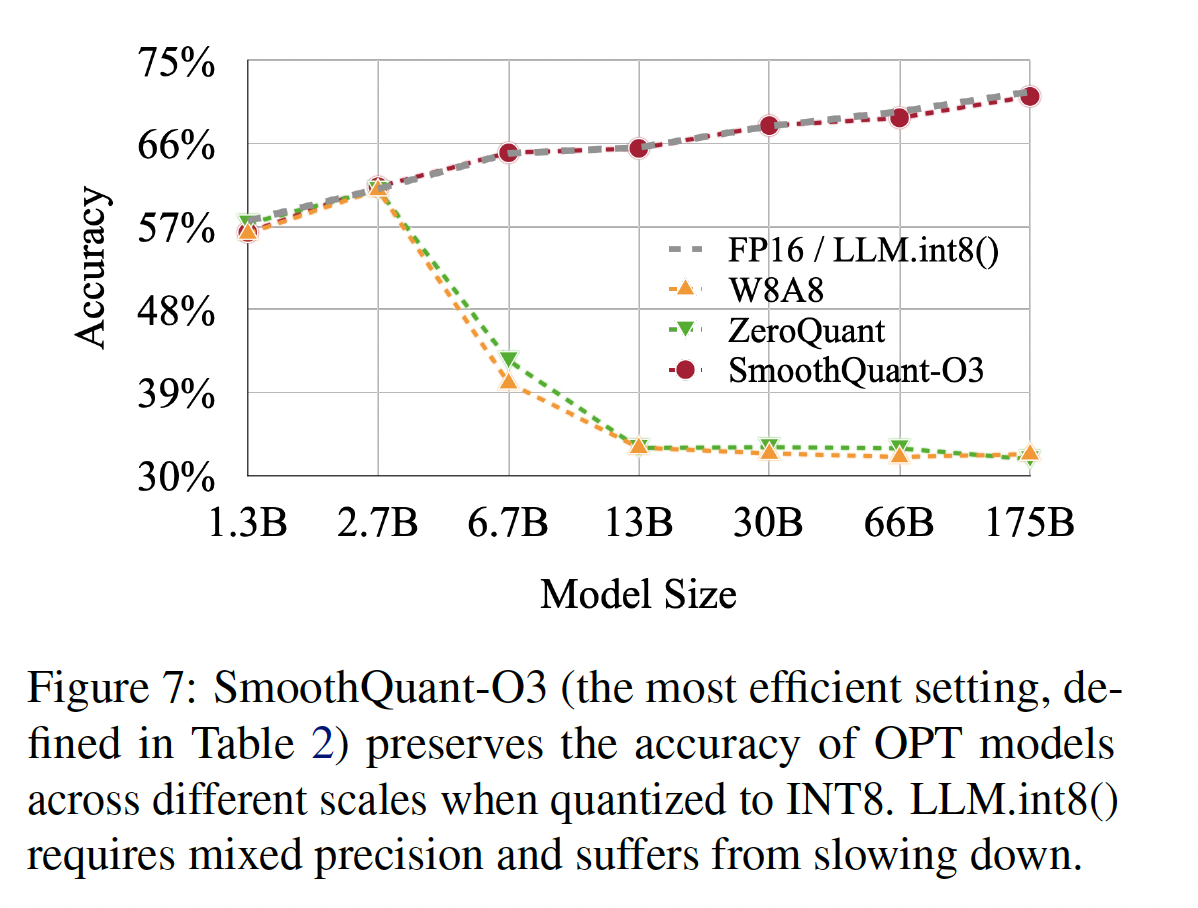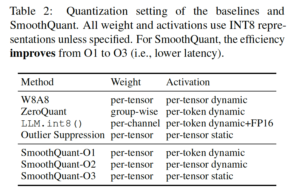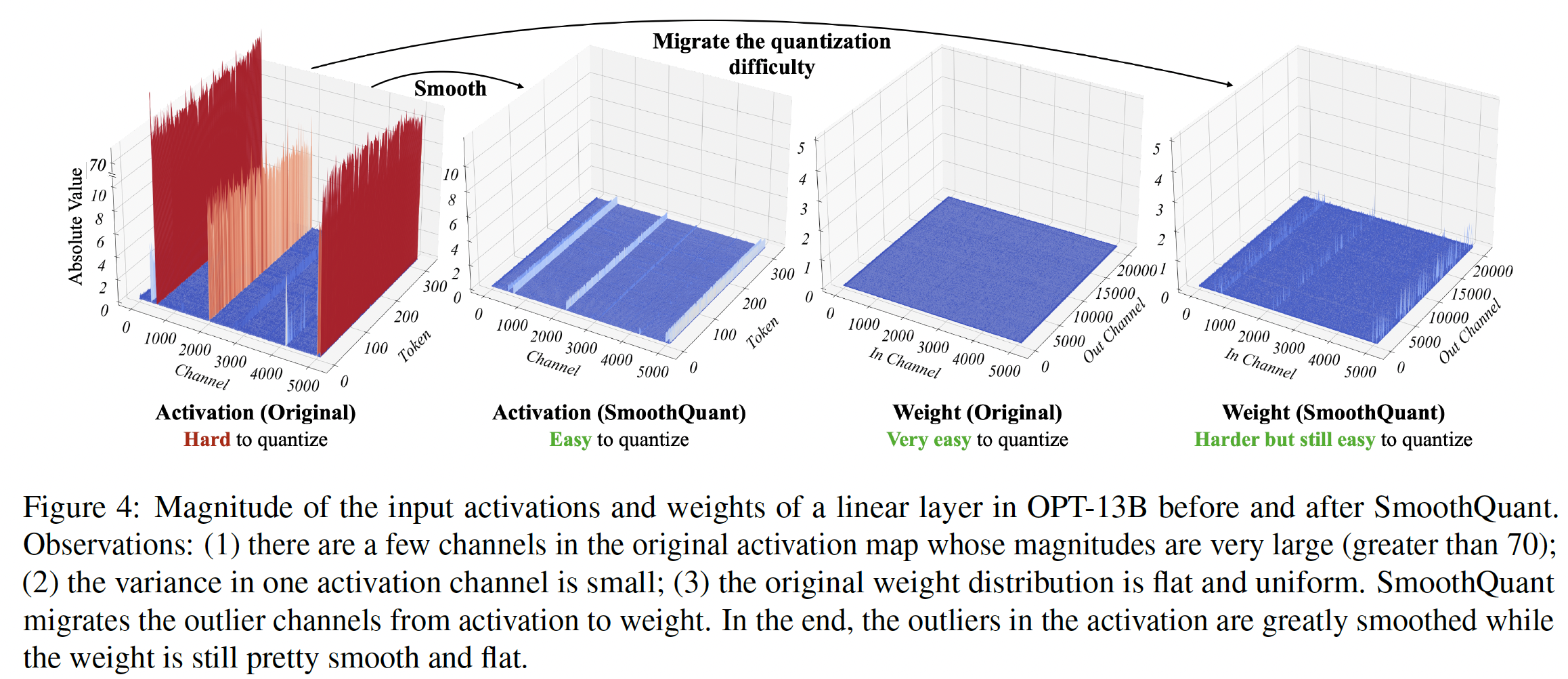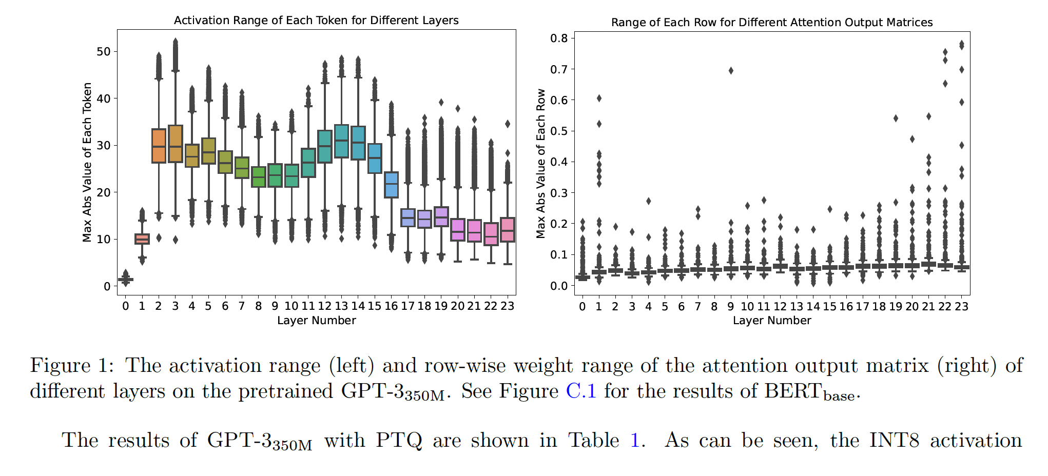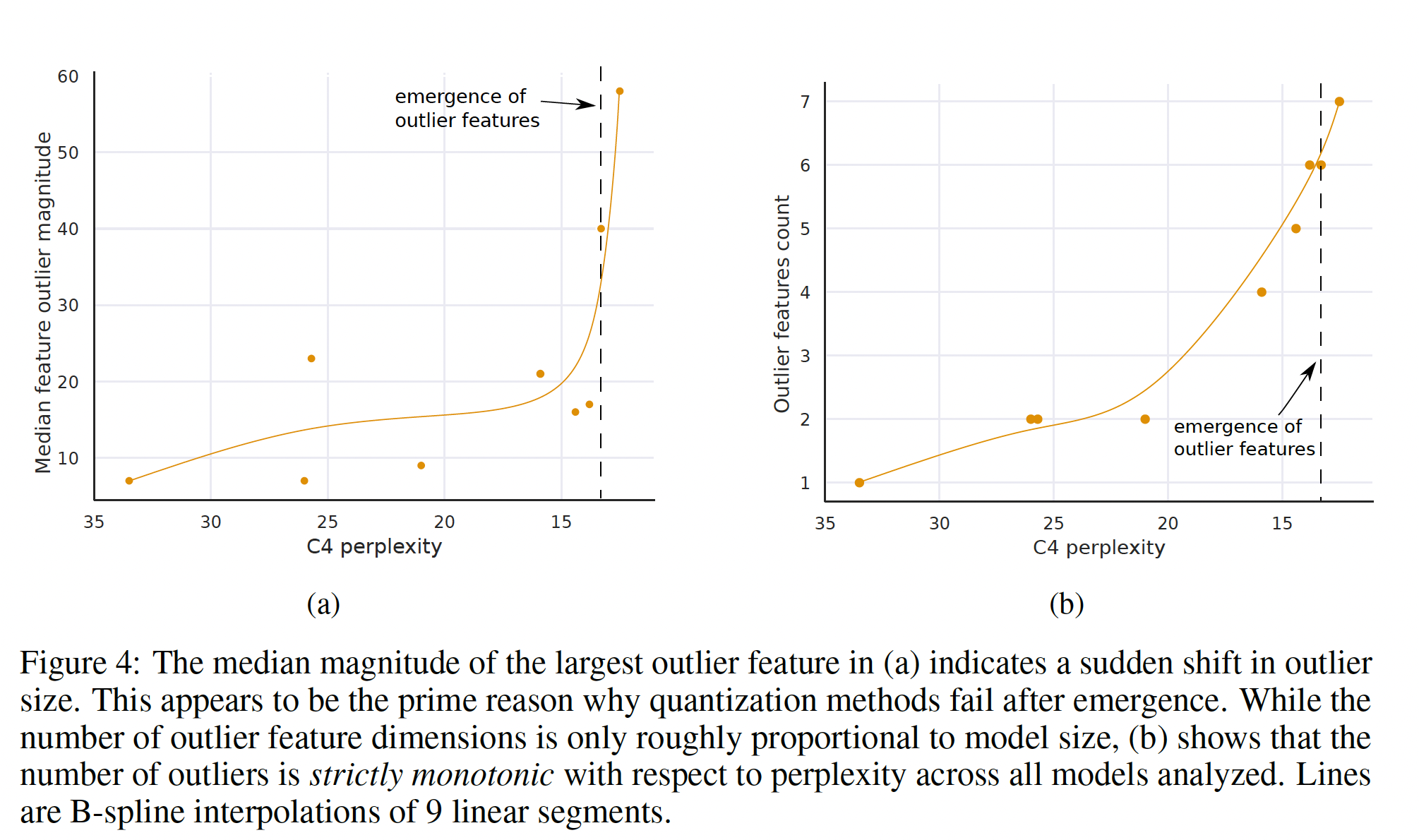 LLM.int8() 观察到在少数 feature dimensions 中的 activation outliers 会破坏更大模型的量化,并提出通过以更高的精度来保持这些维度从而来解决这个问题。