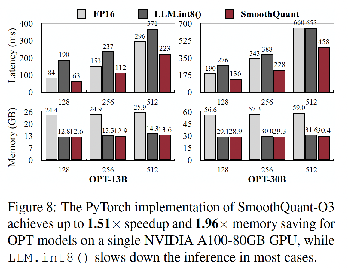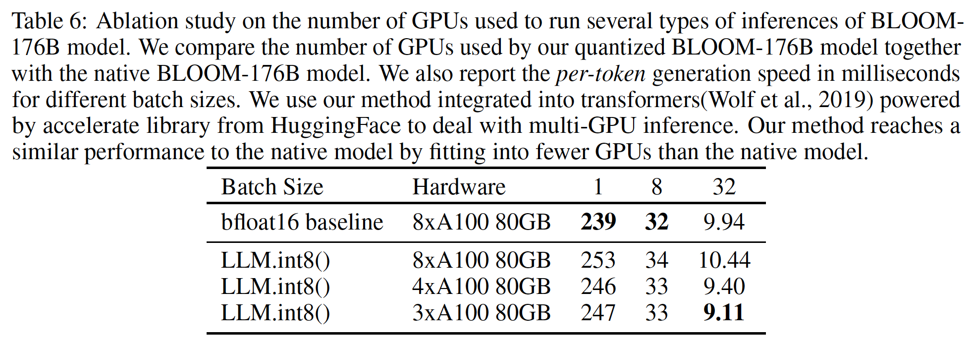 对于 NVIDIA A6000 (具有更低的内存带宽),这种策略甚至更有效:在 2 个 A6000 GPU 上执行 3-bit OPT-175B 模型将延迟从 FP16 版本的 589 毫秒(在 8 个 GPU 上)降低到 130 毫秒,延迟降低了 4.5 倍。