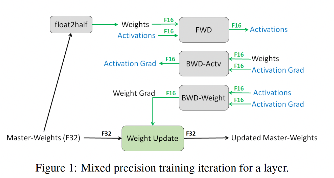 在混合精度训练中,权重、activations 以及梯度以 FP16 格式存储。为了匹配 FP32 网络的准确率,我们维护权重的一份 FP32 master copy ,并在 optimizer step 中用 weight gradient 来更新它。在每次迭代中,使用 master weights 的 FP16 copy 进行正向传播和反向传播,将 FP32 training 所需的存储和带宽减半。Figure 1 说明了这种混合精度训练过程。