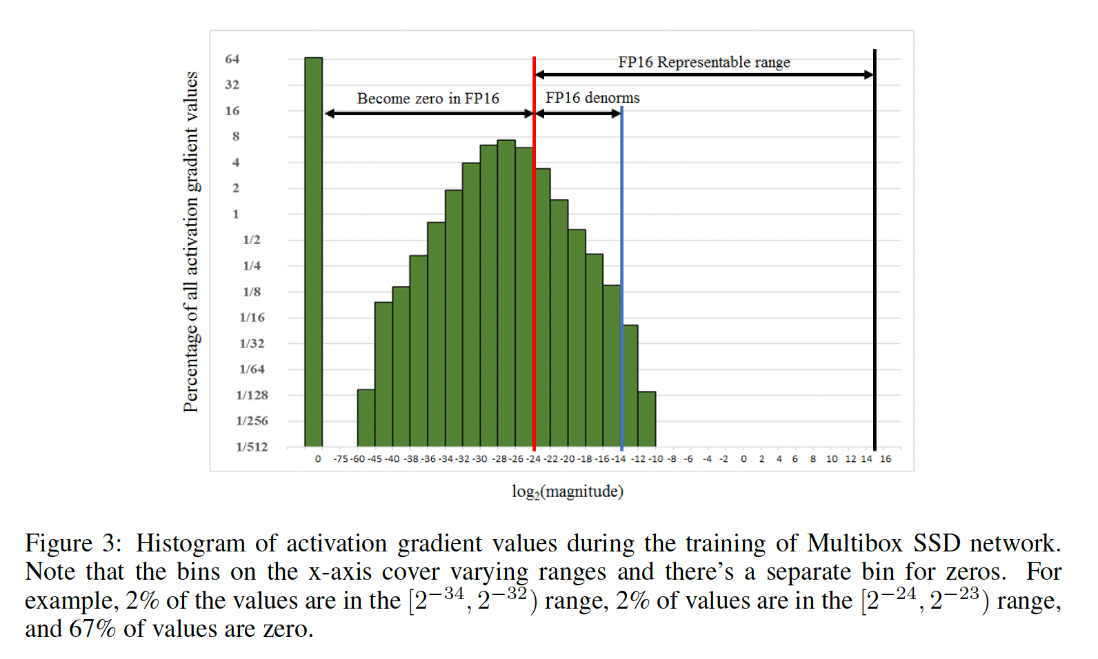 FP16 exponent 将 normalized value exponents 范围有偏地居中到 [-14,15] ,而实际梯度值往往以小 magnitudes ( negative exponents )为主。例如,考虑 Figure 3,显示了在 FP32 训练 Multibox SSD 检测器网络过程中收集的所有层的 activation gradient values 的直方图。注意,FP16 可表示范围的大部分未被使用,而许多值低于最小可表示范围并变为零。 scaling up 梯度将使它们占用更多的可表示范围,并保留一些值(如果不 scaling up,这些值将会因为零而丢失)。