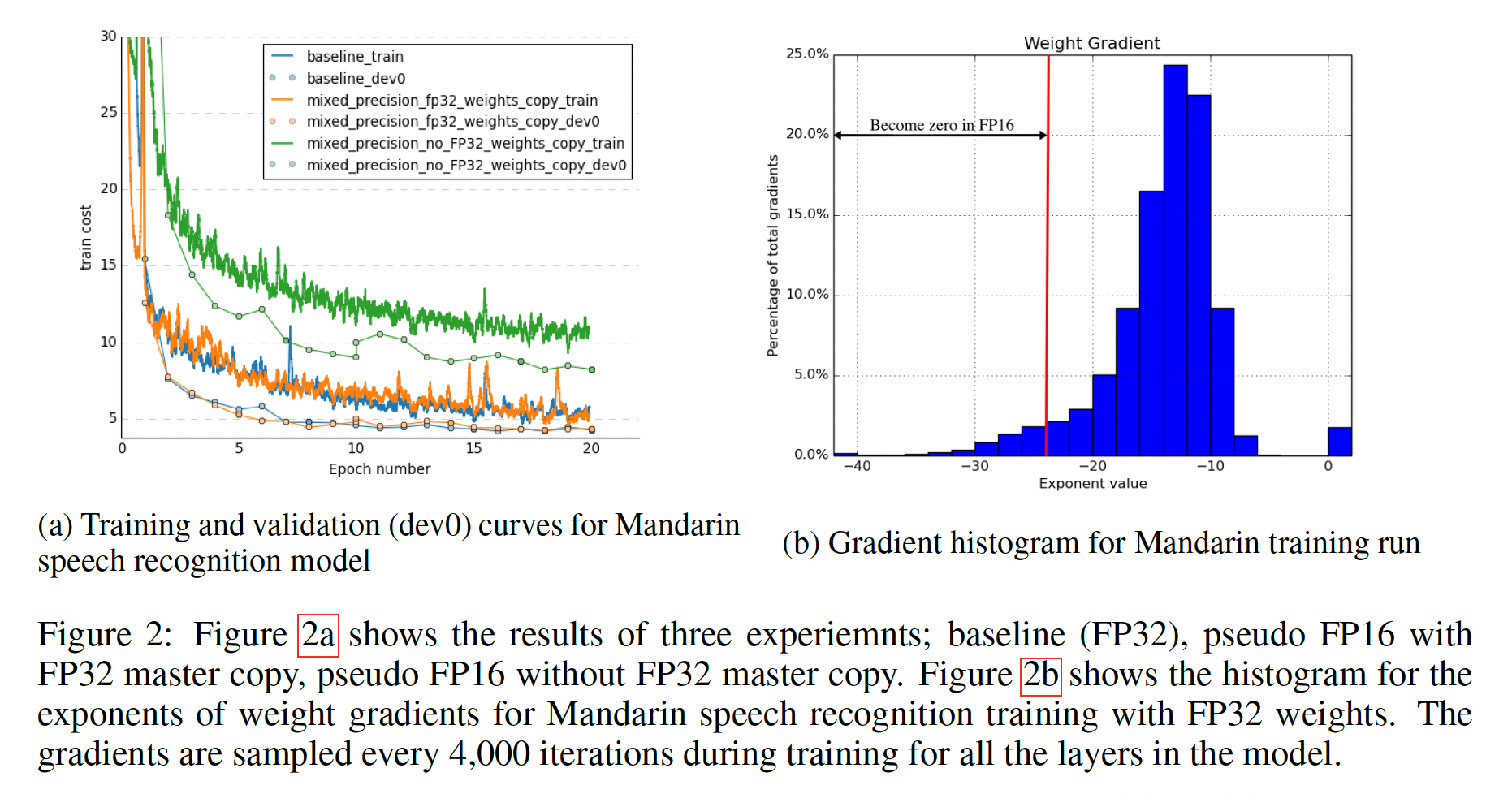为了说明权重的 FP32 master copy 的必要性,我们使用了 Mandarin 语音模型在约 800 小时的语音数据上训练 20 epochs 。如Figure 2a 所示,当在 FP16 forward and backward passes 之后更新 FP32 master copy of weights 时,我们匹配了 FP32 training 结果;而更新 FP16 weights 则导致 80% 的相对 accuracy loss 。