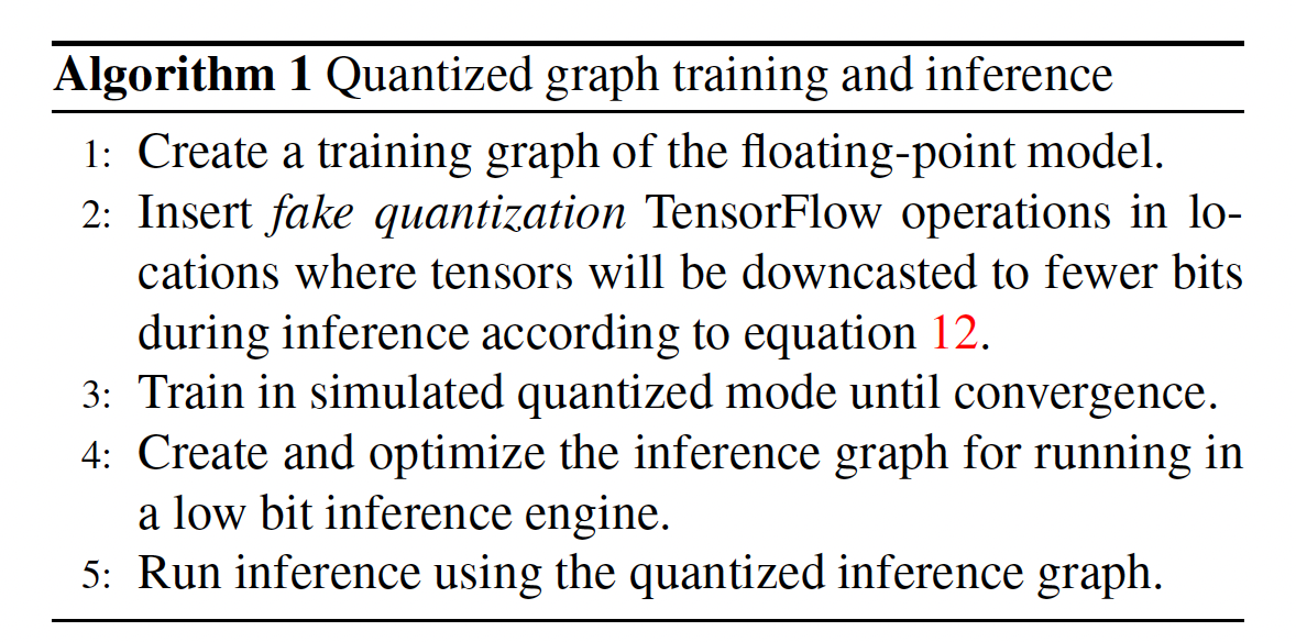 下面我们假设神经网络的计算被捕获为 TensorFlow graph ,然后描述 simulated quantization 。典型的工作流程在 Algorithm 1 中描述。通过 fusing and removing operations 的inference graph 的优化,超出了本文范围。用于 graph modifications 的源码(插入 fake quantization 操作、创建和优化 inference graph)、以及 low bit inference engine 已在 《Tensorflow quantized training support》 中通过 TensorFlow contributions 开源。
