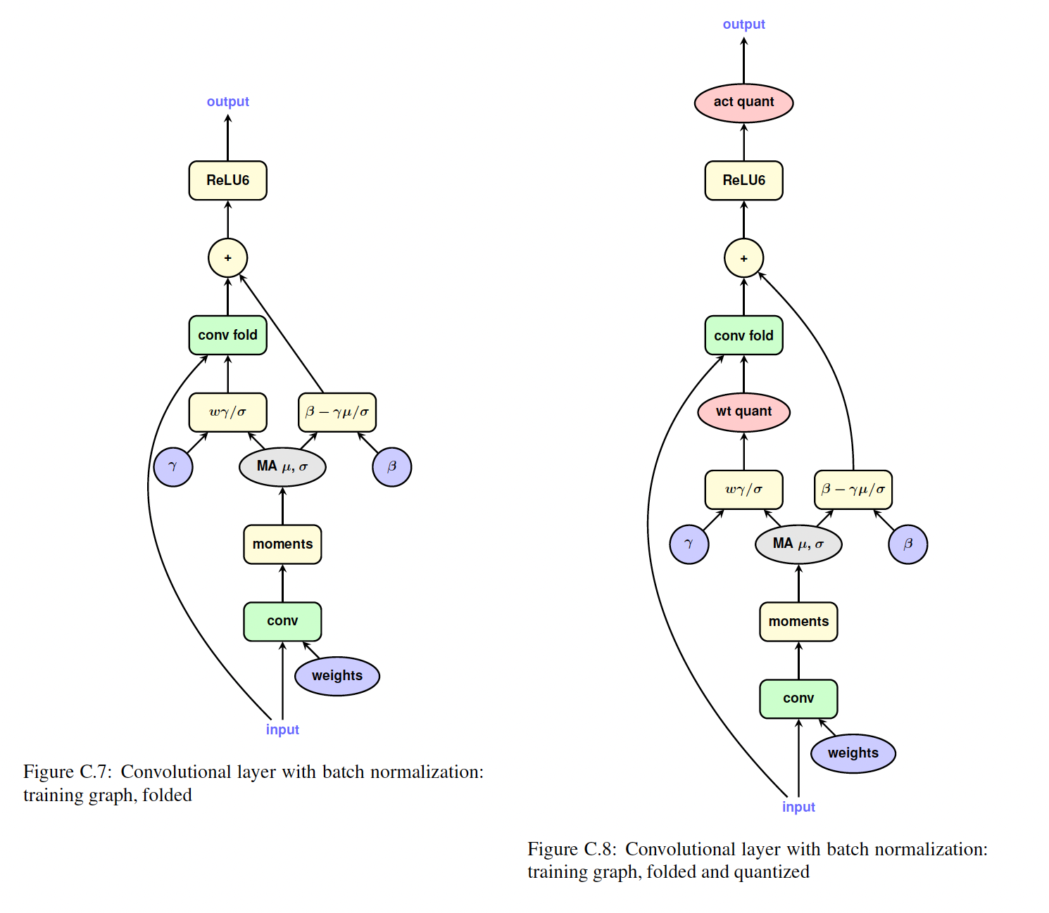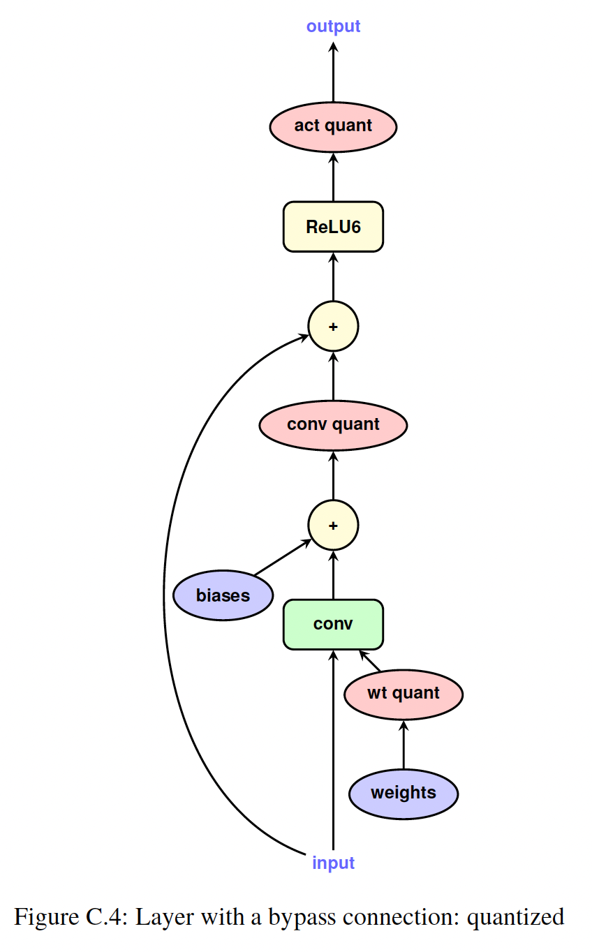 activations 在这样的时点上被量化:在推理期间 activations 被量化的点。例如:在 activation function 应用于卷积层或全连接层输出之后、或在像 ResNet 中那样多个层的输出相加或拼接的 bypass connection 之后。