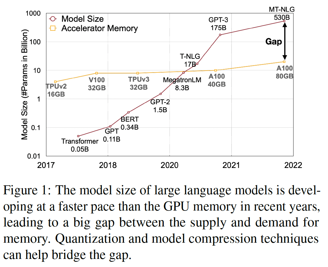 来自 Transformer 家族的 pretrained 生成式模型(如 GPT 或 OPT ),在复杂的语言建模任务中展示了突破性的性能,导致了人们巨大的学术的和实际的兴趣。它们的一个主要障碍是计算成本和存储成本,这些成本在已知模型中是最高的。例如,性能最佳的模型变种,即 GPT3-175B ,参数量级达 175B ,需要数十到数百个 GPU years 才能训练(《OPT: Open pre-trained transformer language models》)。即使是在更简单的任务,即在 pre-trained 模型上进行推理,也非常具有挑战性(这也是我们在本文中关注的焦点):例如,GPT3-175B 的参数以 compact float16 format 存储时,占用 326GB (以 1024 为基数计算)的内存。这甚至超过了最高端的 single GPU 的容量,因此推理必须使用更复杂的和更昂贵的 setup 来执行,例如 multi-GPU deployments 。