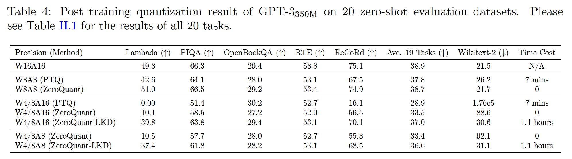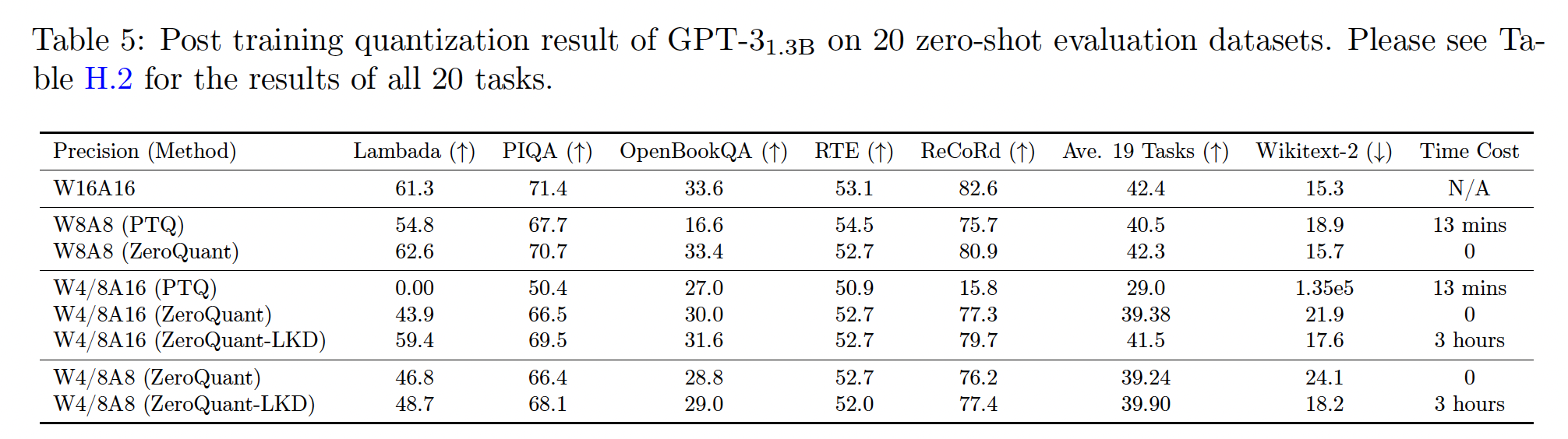 ZeroQuant 进一步提出了类似于 AdaQuant 的逐层知识蒸馏(layer-wise knowledge distillation ),但它可以应用这种方法的最大模型只有 1.3B 参数。在这种规模下,ZeroQuant 已经需要 3 小时的计算;而 GPTQ 在 4 小时内量化了大约100 倍的模型。