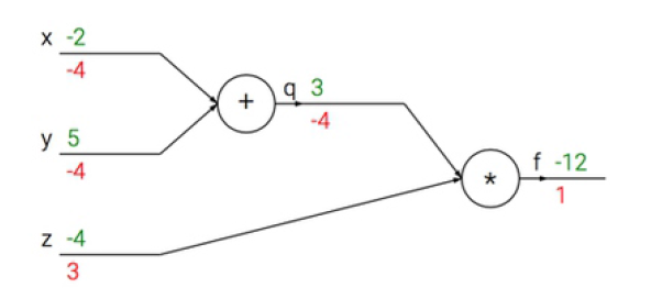 假设 ,则计算图如下。其中:绿色为前向传播的值,红色为反向传播的结果。