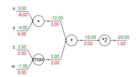 在多数情况下,反向传播中的梯度可以被直观地解释。如:加法单元、乘法单元、最大值单元。