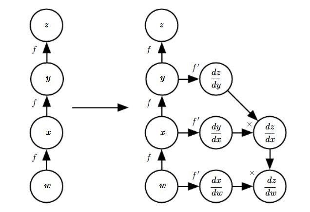 下图左侧为 的计算图,右侧添加了若干节点从而给出了计算 的计算图。