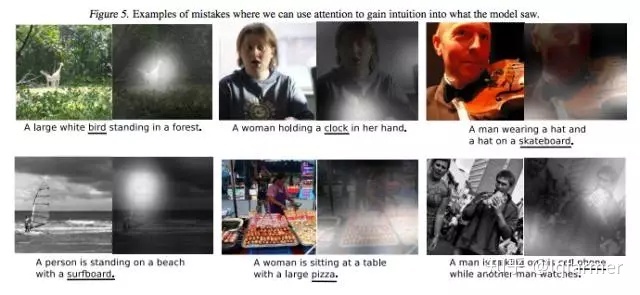 在图像标注中,解释了图片不同区域对输出文本序列的影响程度。如下图所示为图像标注中,影响输出单词的图像块。