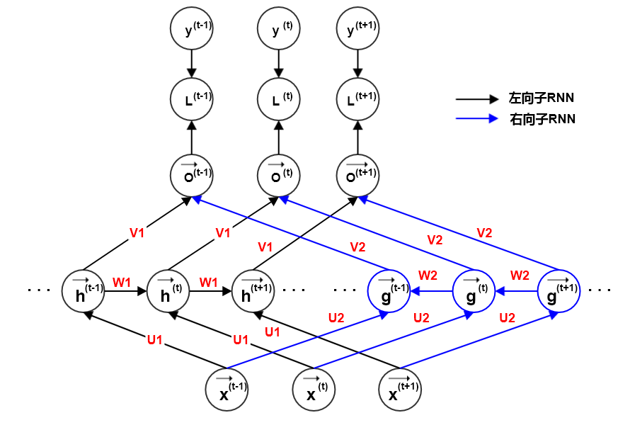 其中输出到隐状态的权重为 ,隐状态到输出的权重为 ,隐状态到隐状态的权重为 , 为输入偏置向量和输出偏置向量。
