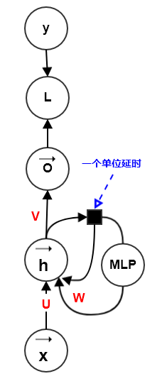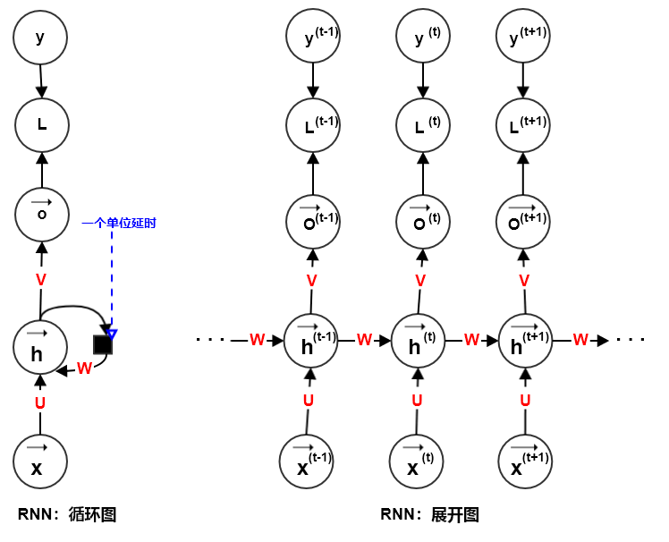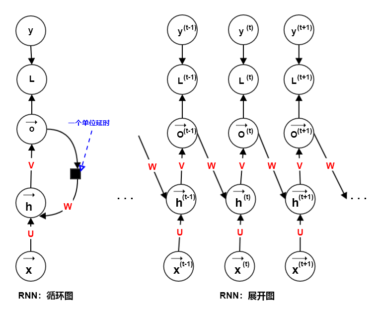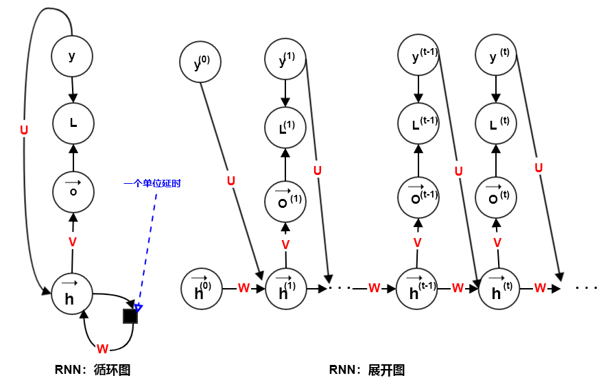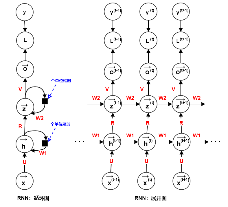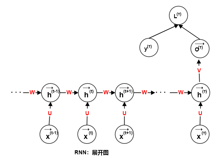 以 多输出&隐-隐RNN为例,设:输入到隐状态的权重为 ,隐状态到输出的权重为 ,隐状态到隐状态的权重为 , 为输入偏置向量和输出偏置向量;激活函数为双曲正切激活函数 。